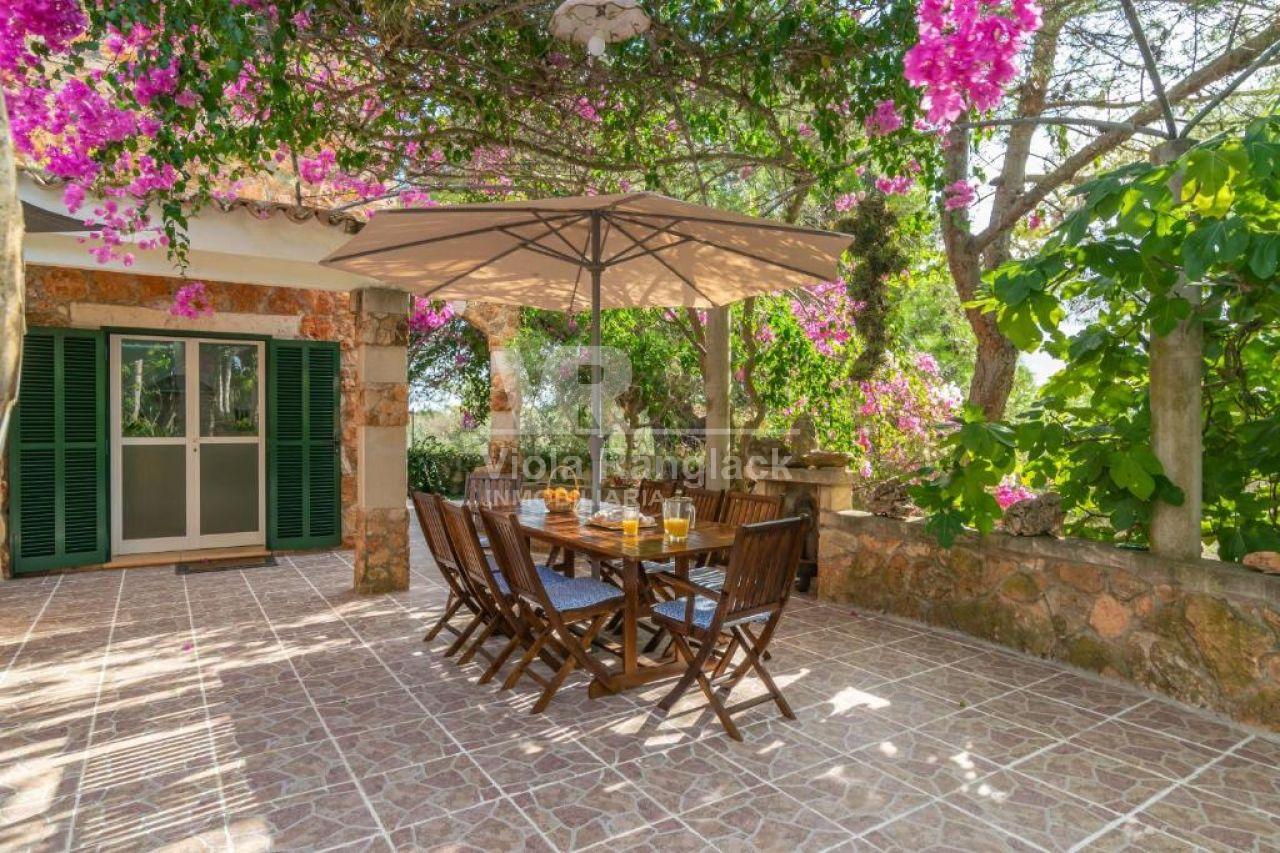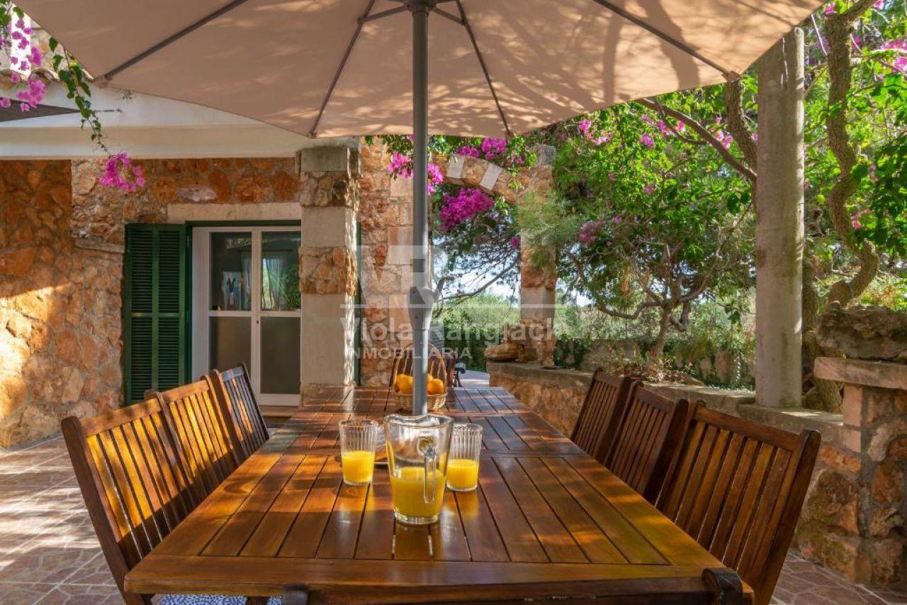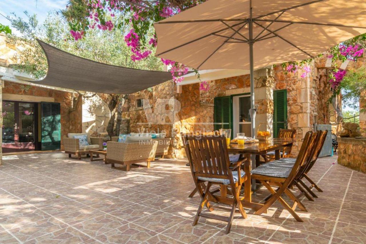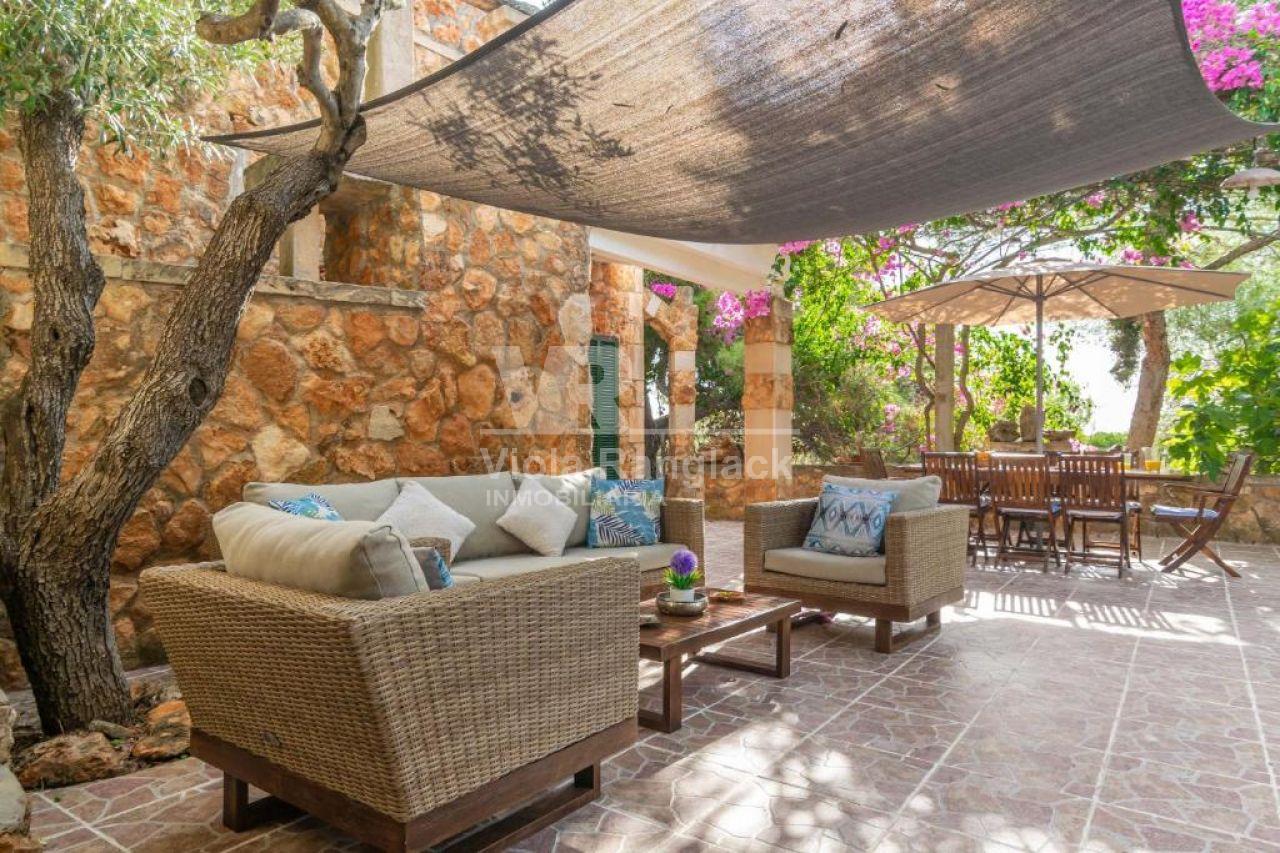 Espaciosa villa de estilo Mallorquín y forrada de piedra , de unos 240m2. Está ubicada a pocos mts de la playa de cala Marçal y Portocolom.