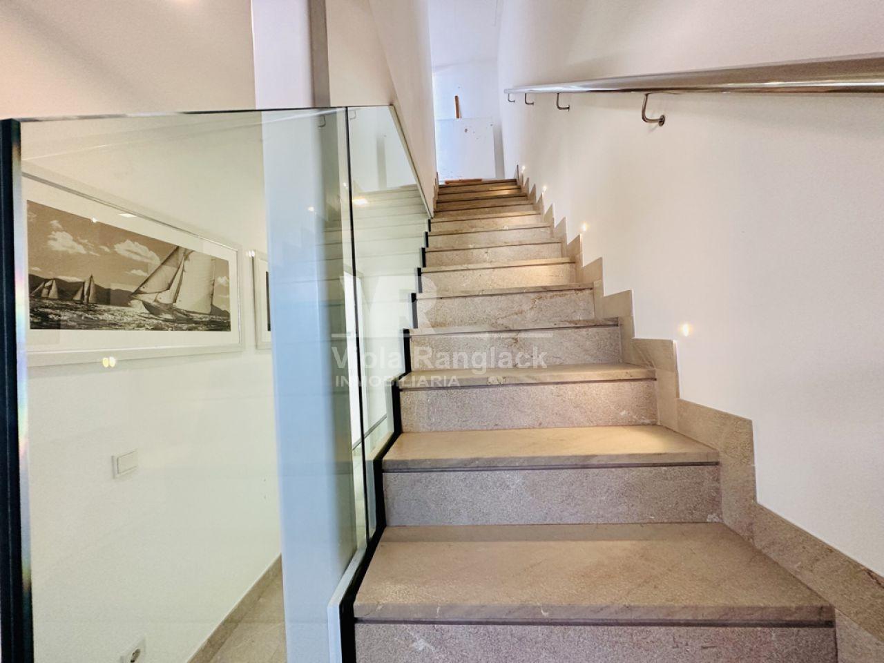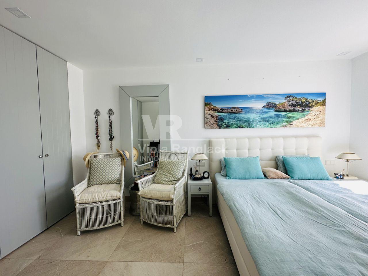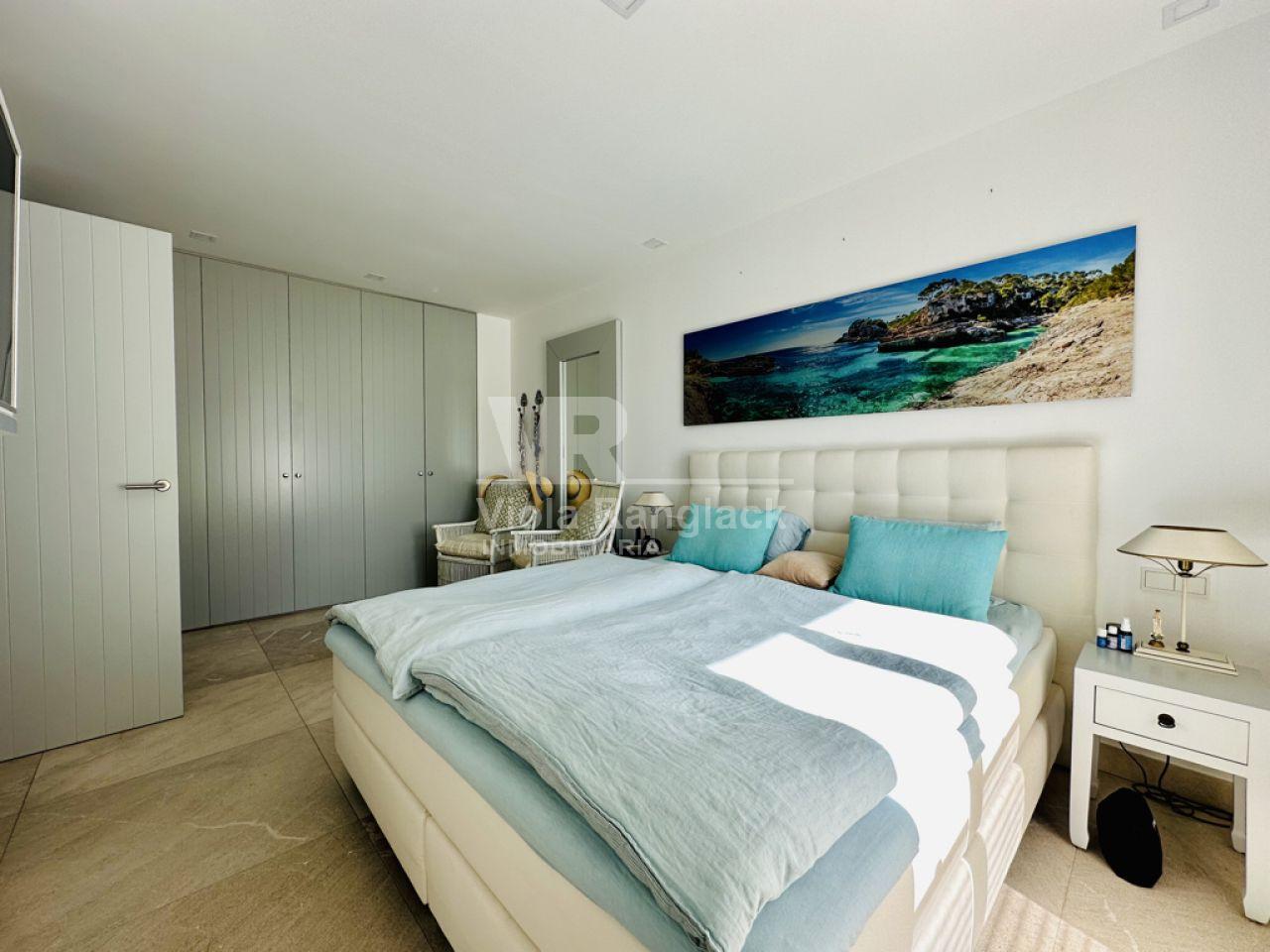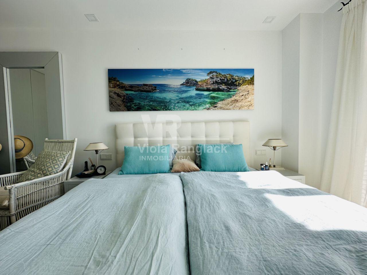 Las escaleras conducen a la primera planta, donde hay dos amplios dormitorios dobles con armarios empotrados. Uno de ellos tiene un moderno cuarto de baño en-suite. Un segundo cuarto de baño también se encuentra en esta planta. Uno de los dormitorios dobles tiene un balcón con vistas al patio. La escalera conduce a la segunda planta, donde se encuentra el amplio salón con una acogedora zona de estar y chimenea. Aquí, también, grandes ventanales conducen a una terraza desde la que se puede disfrutar de una fantástica vista de toda la zona de Portocolom. Esta habitación también se puede convertir en un tercer dormitorio. Otra escalera conduce a la azotea, desde donde la vista es aún más espectacular.