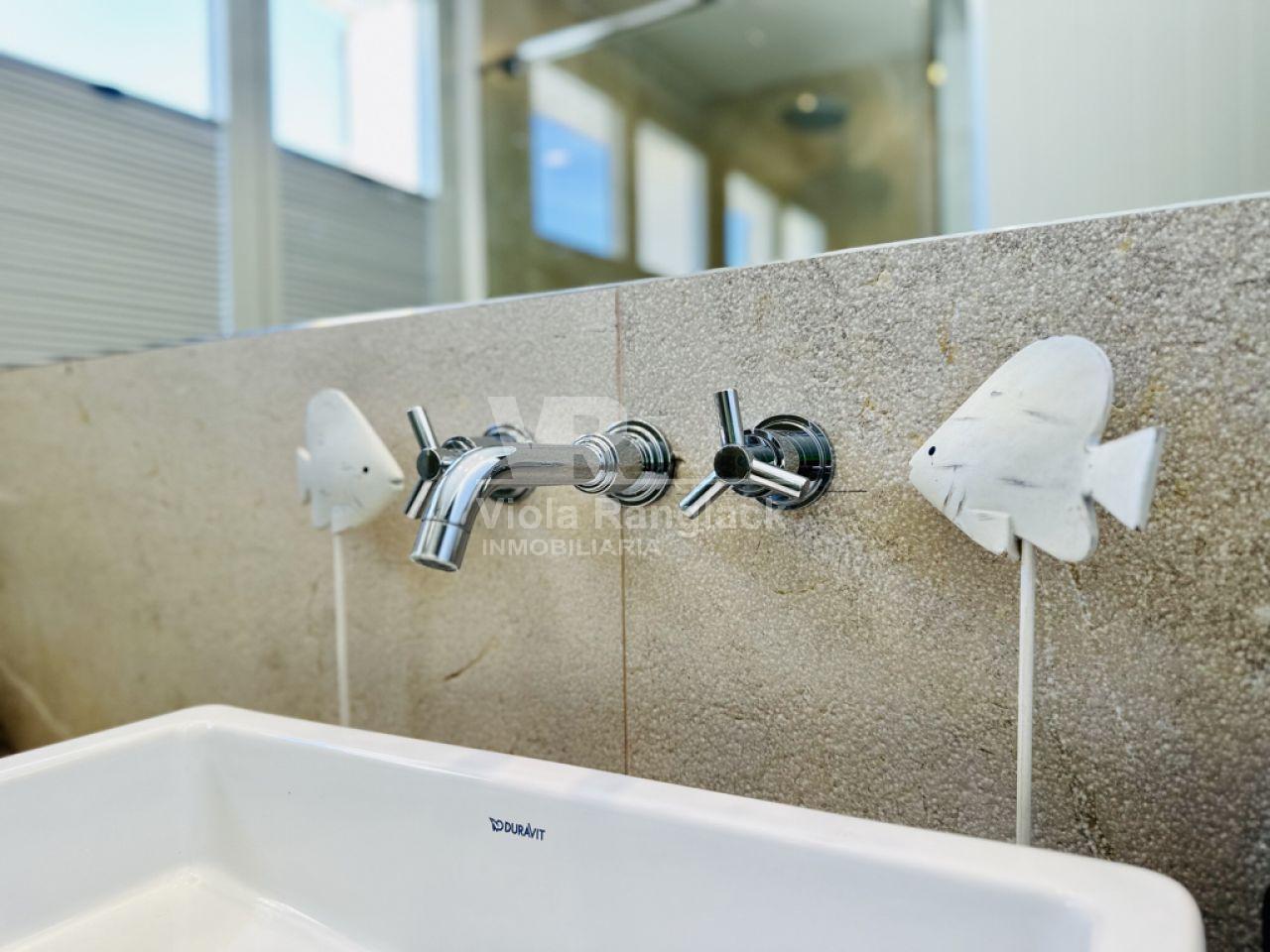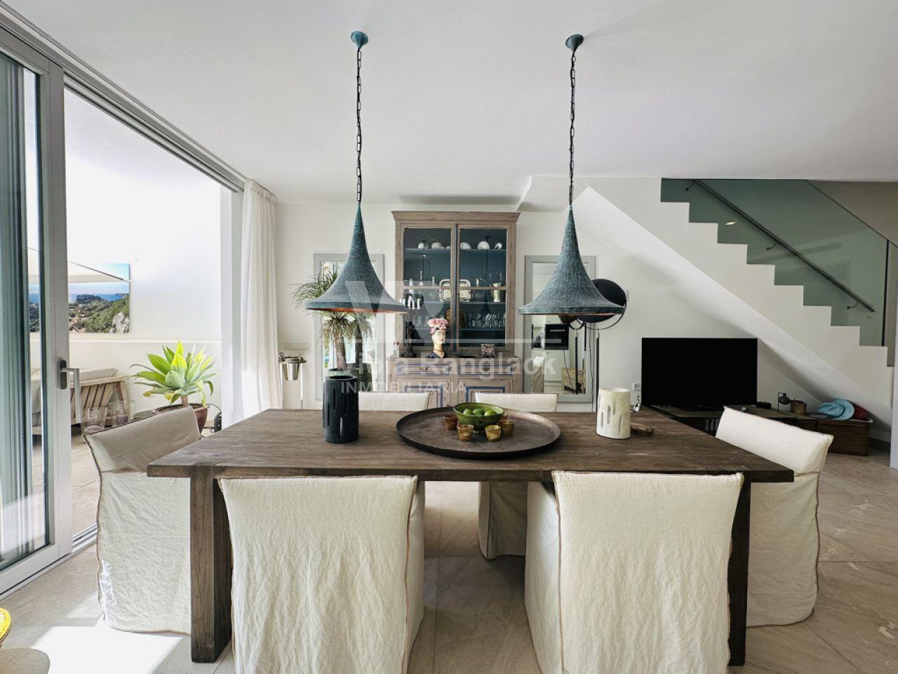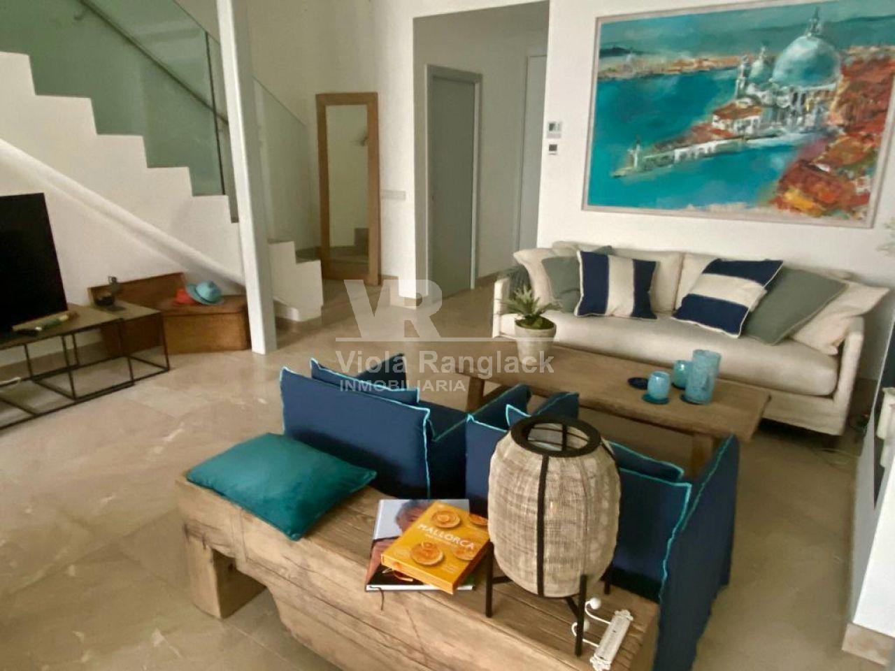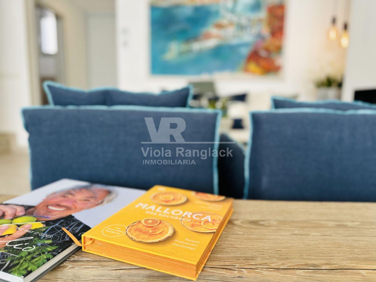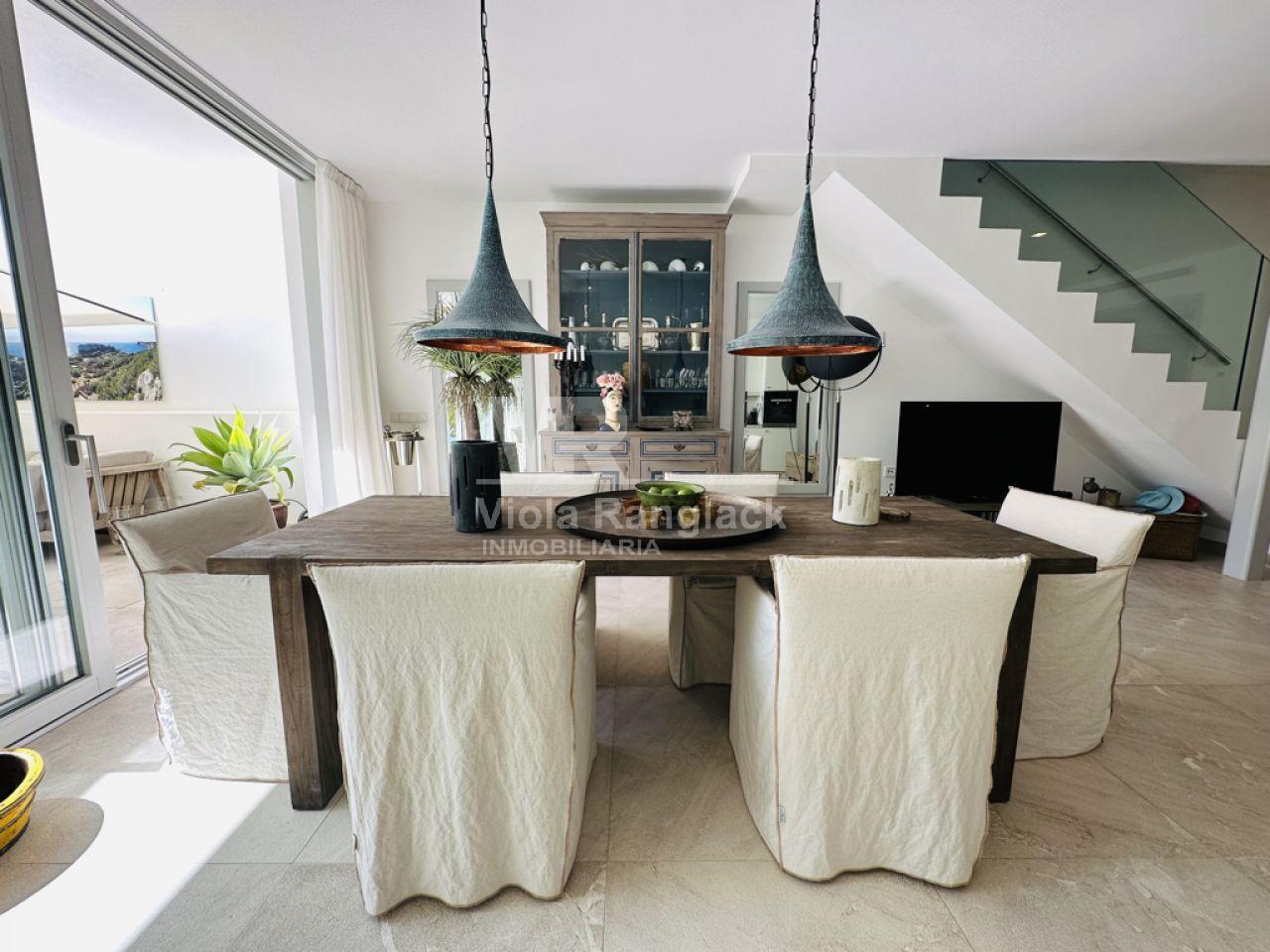 Las escaleras conducen a la primera planta, donde hay dos amplios dormitorios dobles con armarios empotrados. Uno de ellos tiene un moderno cuarto de baño en-suite. Un segundo cuarto de baño también se encuentra en esta planta. Uno de los dormitorios dobles tiene un balcón con vistas al patio. La escalera conduce a la segunda planta, donde se encuentra el amplio salón con una acogedora zona de estar y chimenea. Aquí, también, grandes ventanales conducen a una terraza desde la que se puede disfrutar de una fantástica vista de toda la zona de Portocolom. Esta habitación también se puede convertir en un tercer dormitorio. Otra escalera conduce a la azotea, desde donde la vista es aún más espectacular.