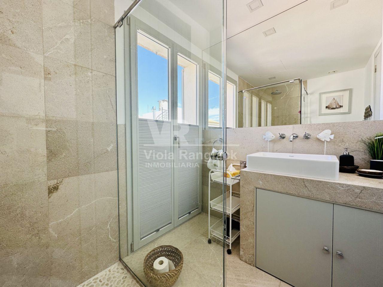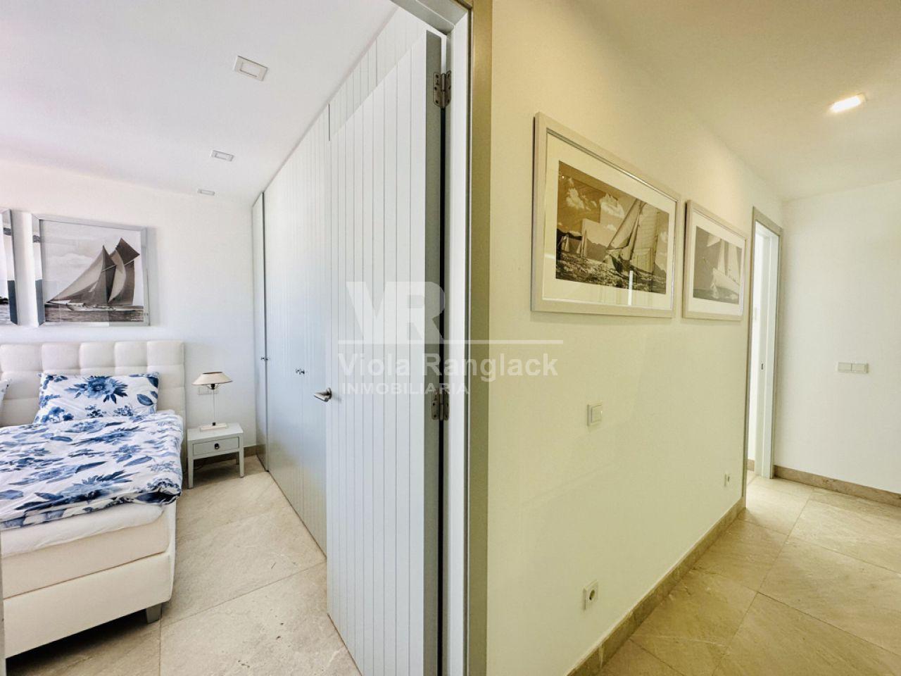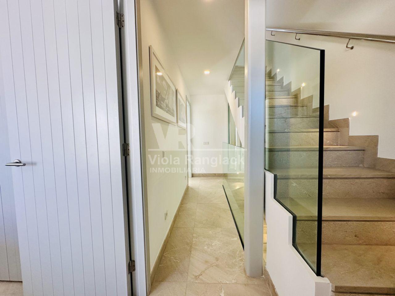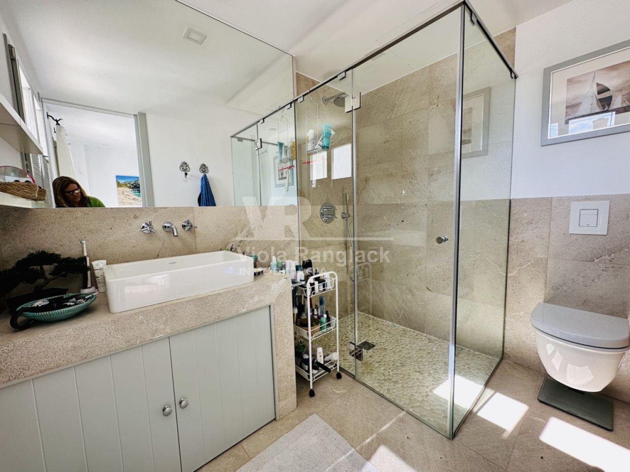 Las escaleras conducen a la primera planta, donde hay dos amplios dormitorios dobles con armarios empotrados. Uno de ellos tiene un moderno cuarto de baño en-suite. Un segundo cuarto de baño también se encuentra en esta planta. Uno de los dormitorios dobles tiene un balcón con vistas al patio. La escalera conduce a la segunda planta, donde se encuentra el amplio salón con una acogedora zona de estar y chimenea. Aquí, también, grandes ventanales conducen a una terraza desde la que se puede disfrutar de una fantástica vista de toda la zona de Portocolom. Esta habitación también se puede convertir en un tercer dormitorio. Otra escalera conduce a la azotea, desde donde la vista es aún más espectacular.