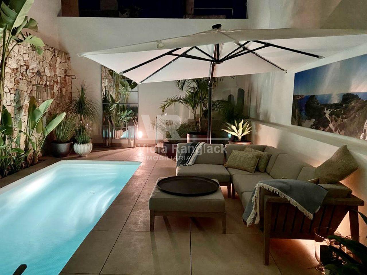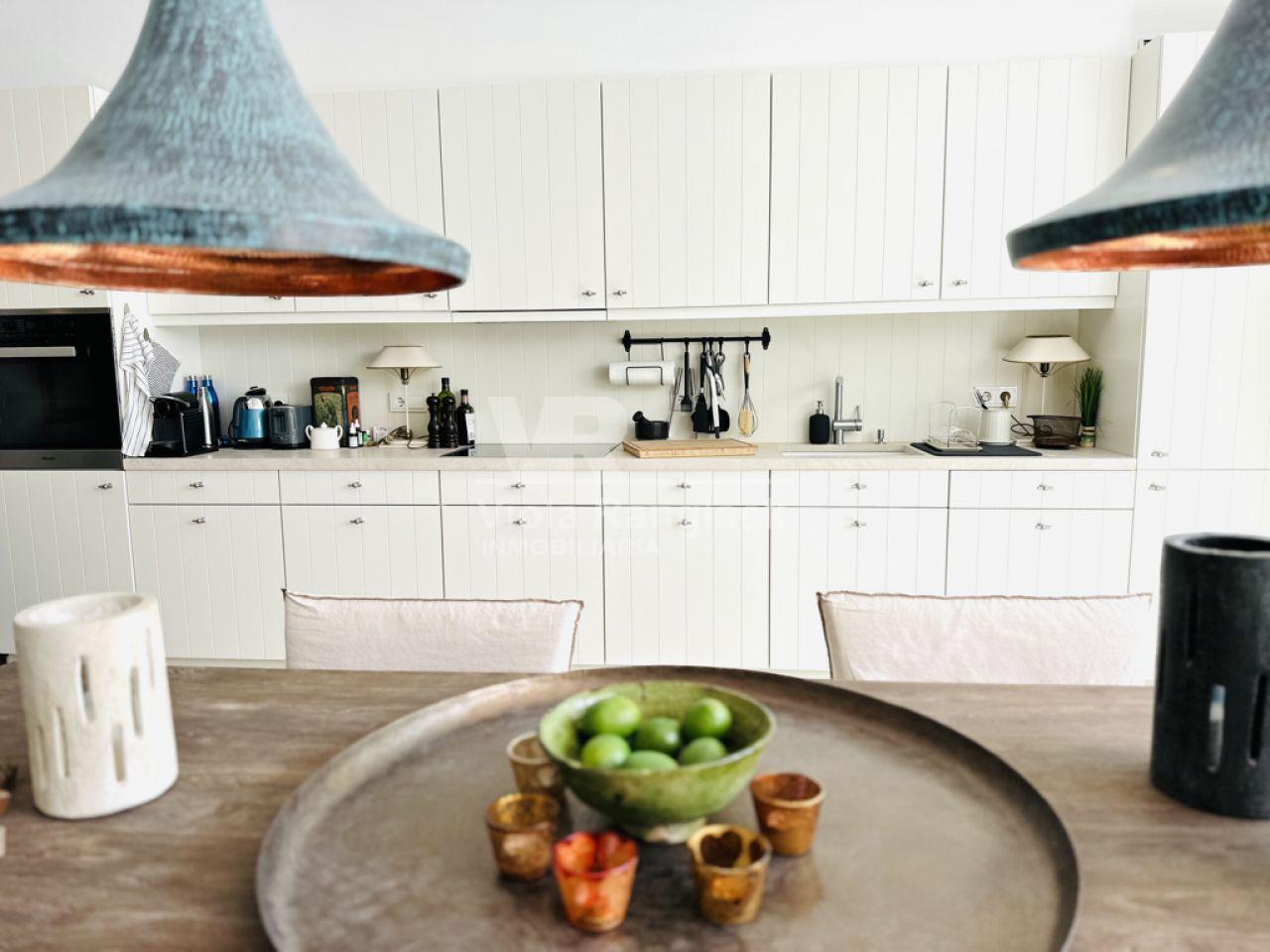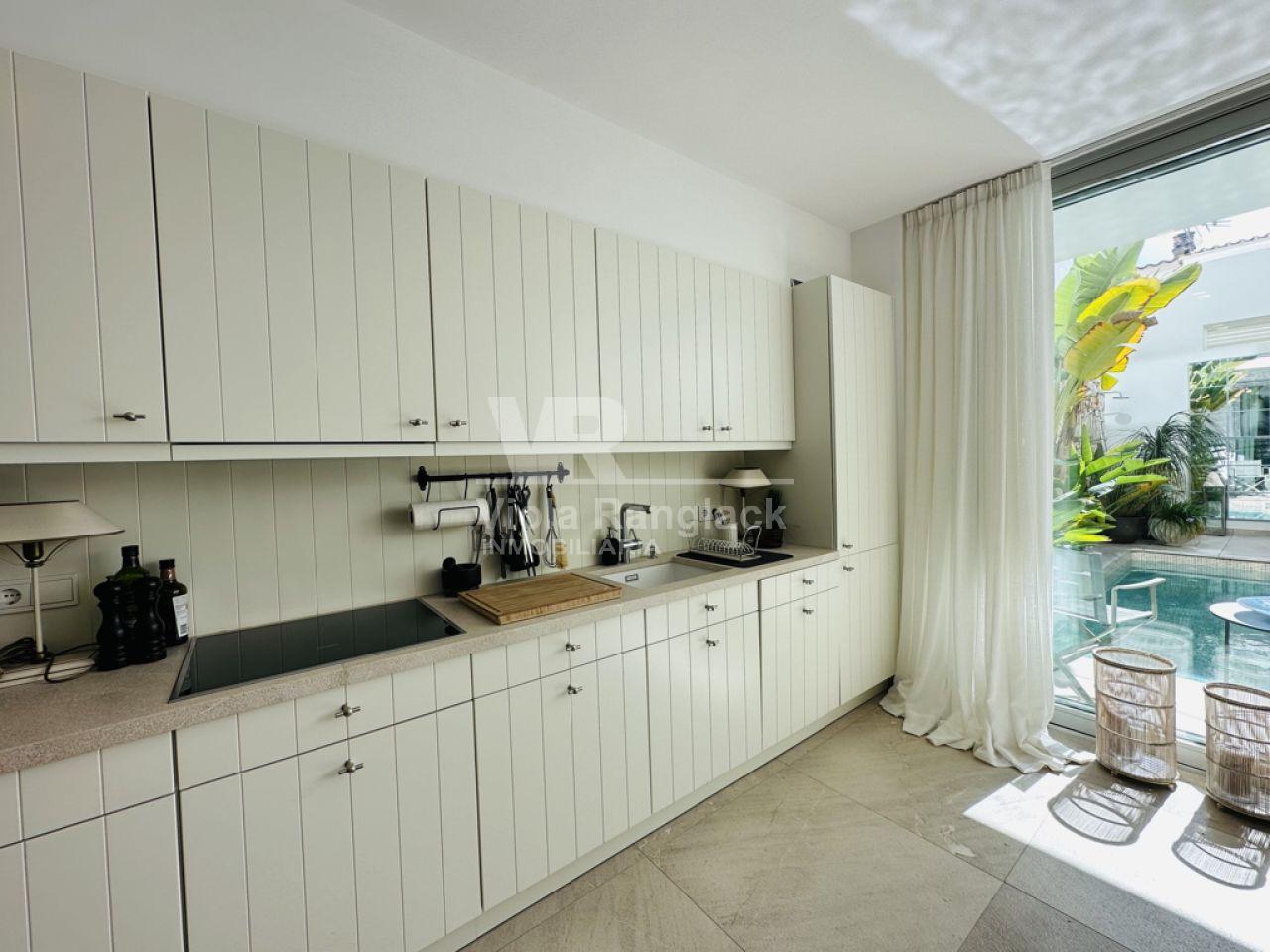 Tiene aprox. 172m2 de superficie habitable y se distribuye en 3 plantas. En la planta baja se encuentra la amplia cocina con zona de estar con chimenea. Una gran puerta francesa deja entrar mucha luz en la habitación y conduce directamente a un patio a una piscina. Como esta propiedad se accede desde dos calles diferentes, hay otra puerta aquí. Un aseo y un lavadero completan la planta baja.