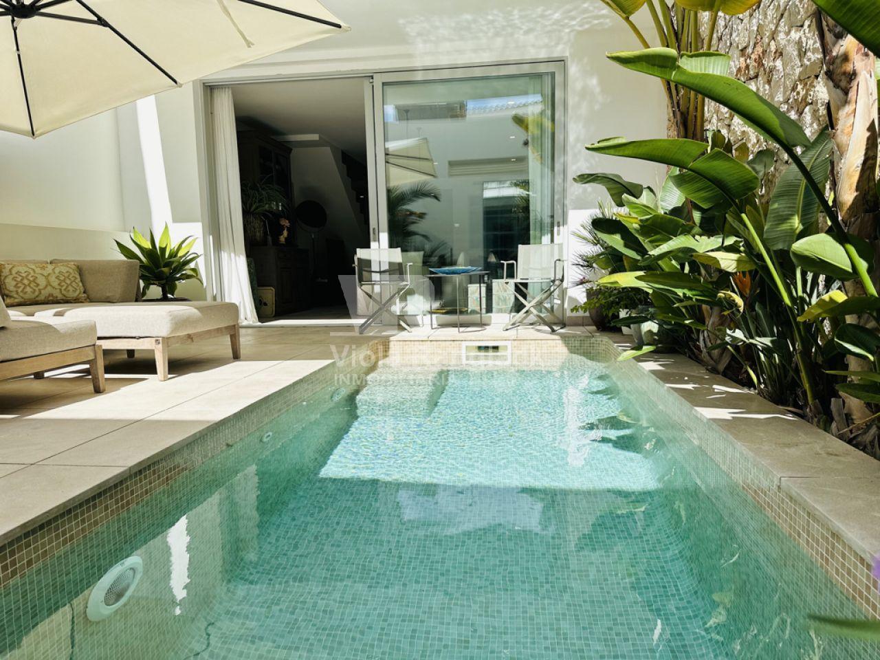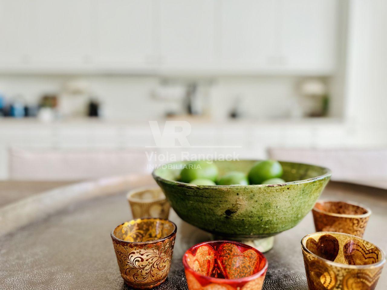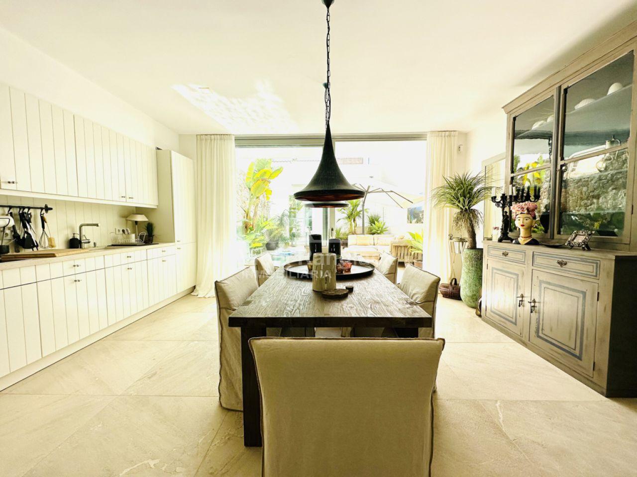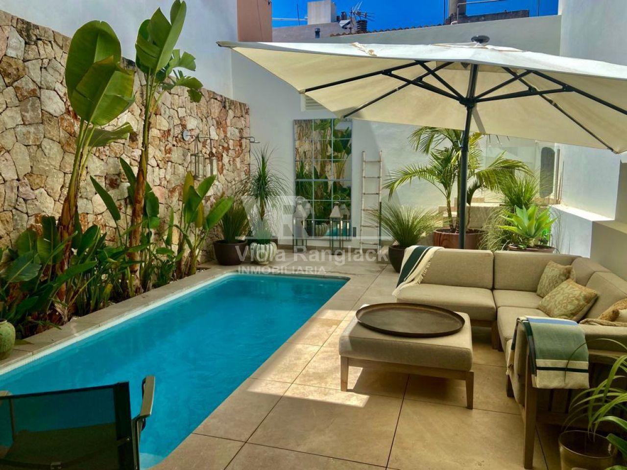 Tiene aprox. 172m2 de superficie habitable y se distribuye en 3 plantas. En la planta baja se encuentra la amplia cocina con zona de estar con chimenea. Una gran puerta francesa deja entrar mucha luz en la habitación y conduce directamente a un patio a una piscina. Como esta propiedad se accede desde dos calles diferentes, hay otra puerta aquí. Un aseo y un lavadero completan la planta baja.