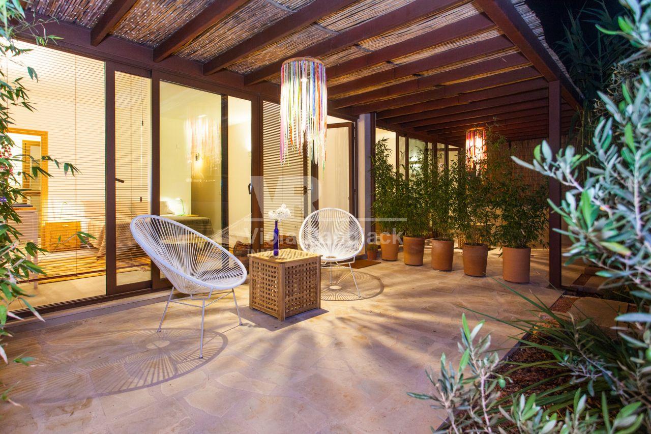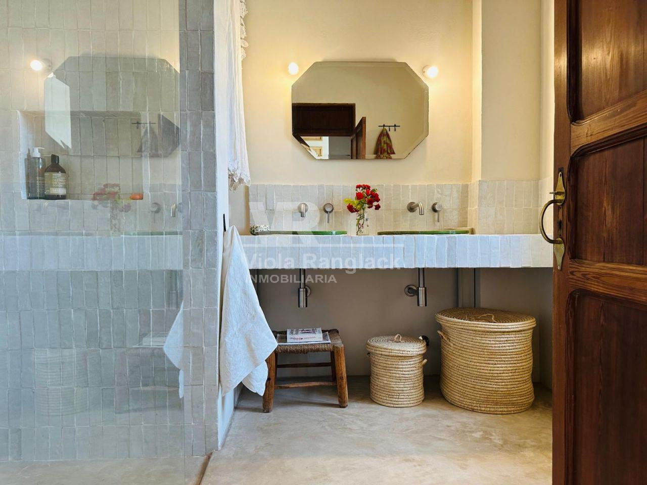 La villa, completamente renovada en 2024, se divide en dos cuerpos principales divididos por una piscina privada con solárium y un gran jardín mediterráneo con sistema de riego automático. Por un lado, la parte tradicional con techos altos alberga la cocina moderna, el salón y dos dormitorios dobles con baño, pérgola y terraza; por otro lado, hay 3 suites amplias, luminosas y de doble exposición, cada una con baño privado con ventana, un pequeño patio en la parte trasera y una terraza sombreada.