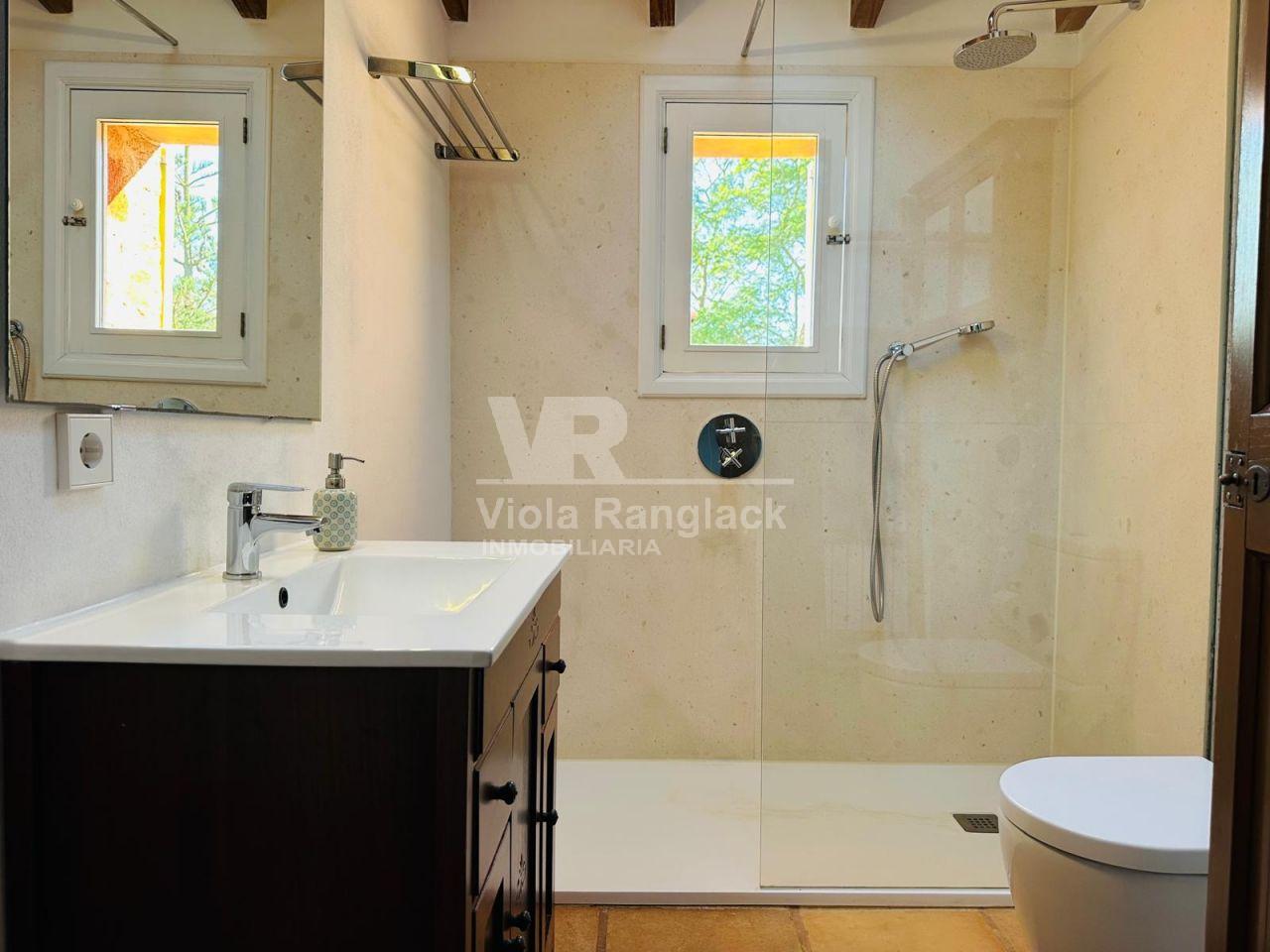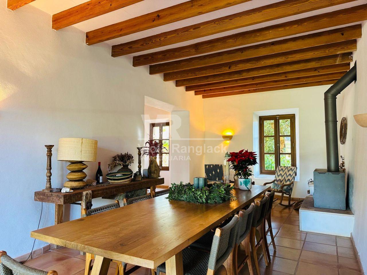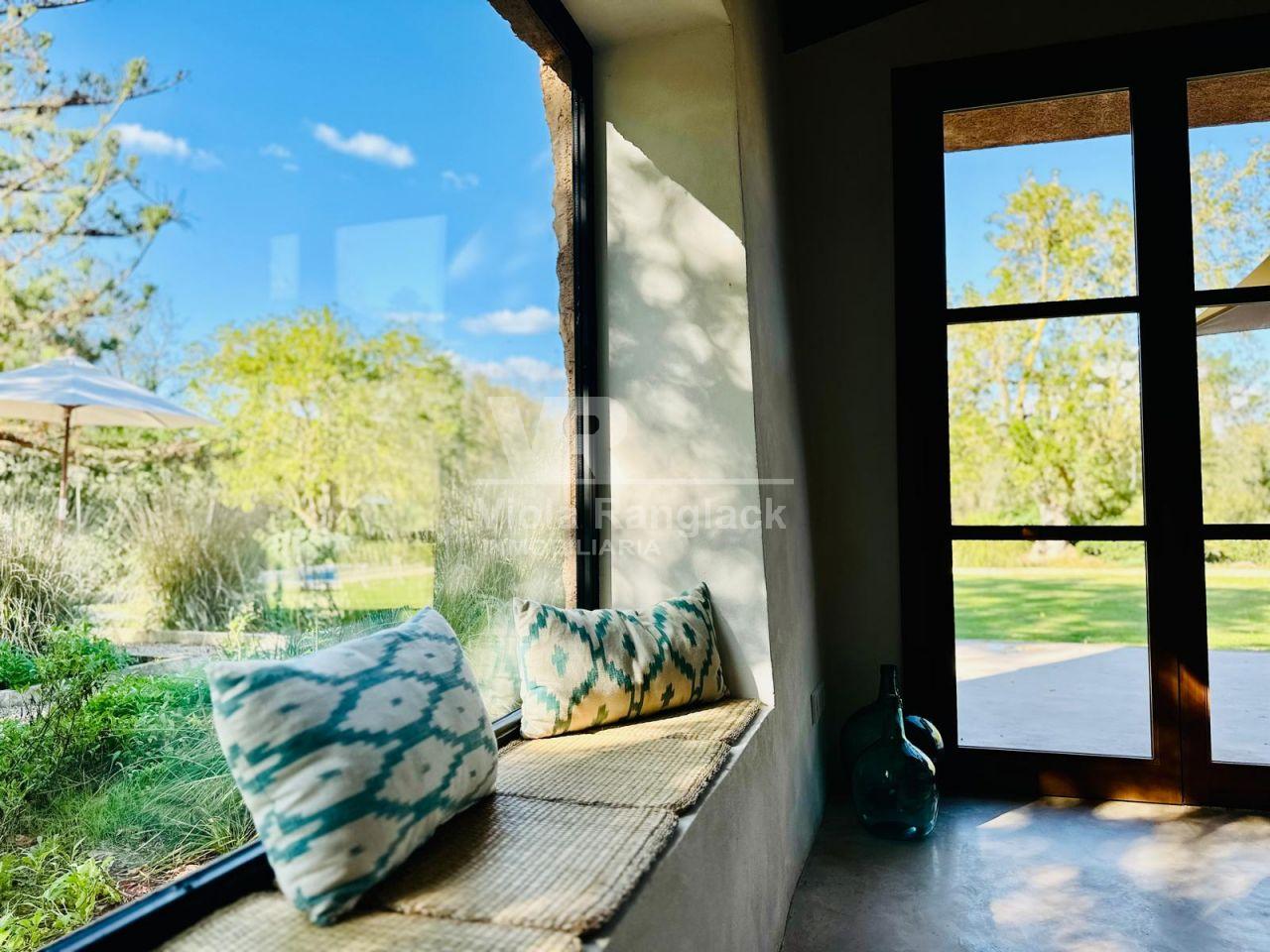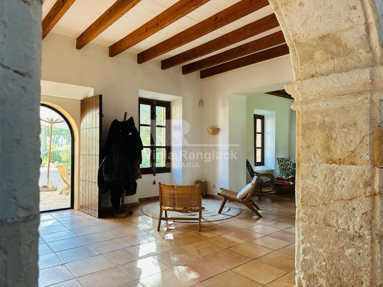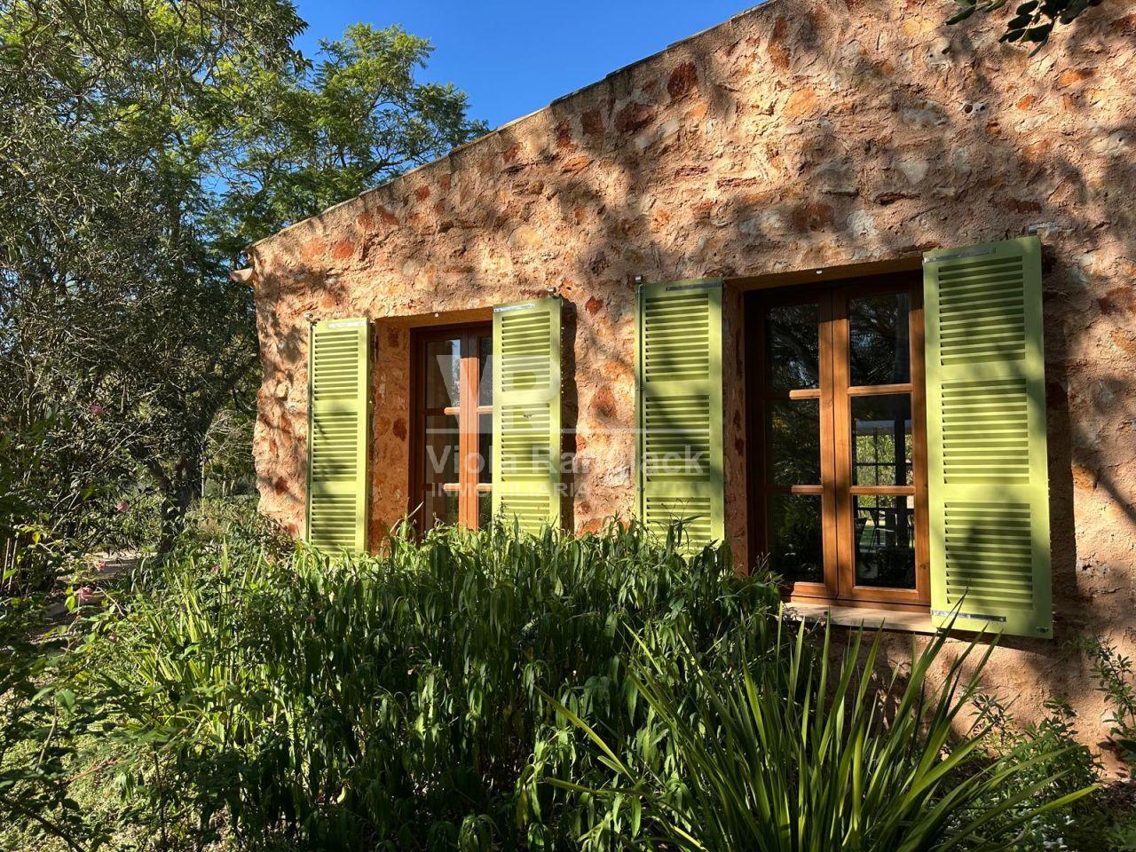 Dentro del mismo terreno y comunicada por el jardín se encuentra una acogedora casa de invitados de 105 m², distribuida en dos plantas con espacios abiertos. Predominan las paredes de marés sellado y suelos de terracota, manteniendo el estilo mallorquín con acabados de alta calidad.