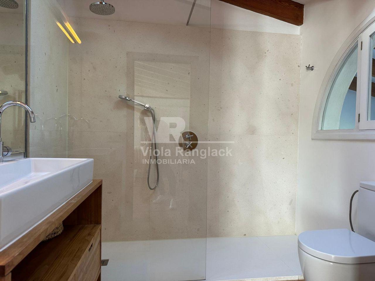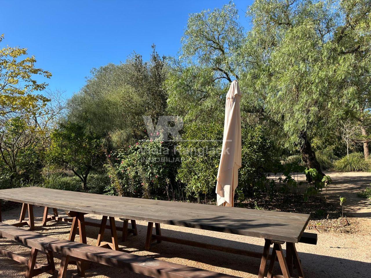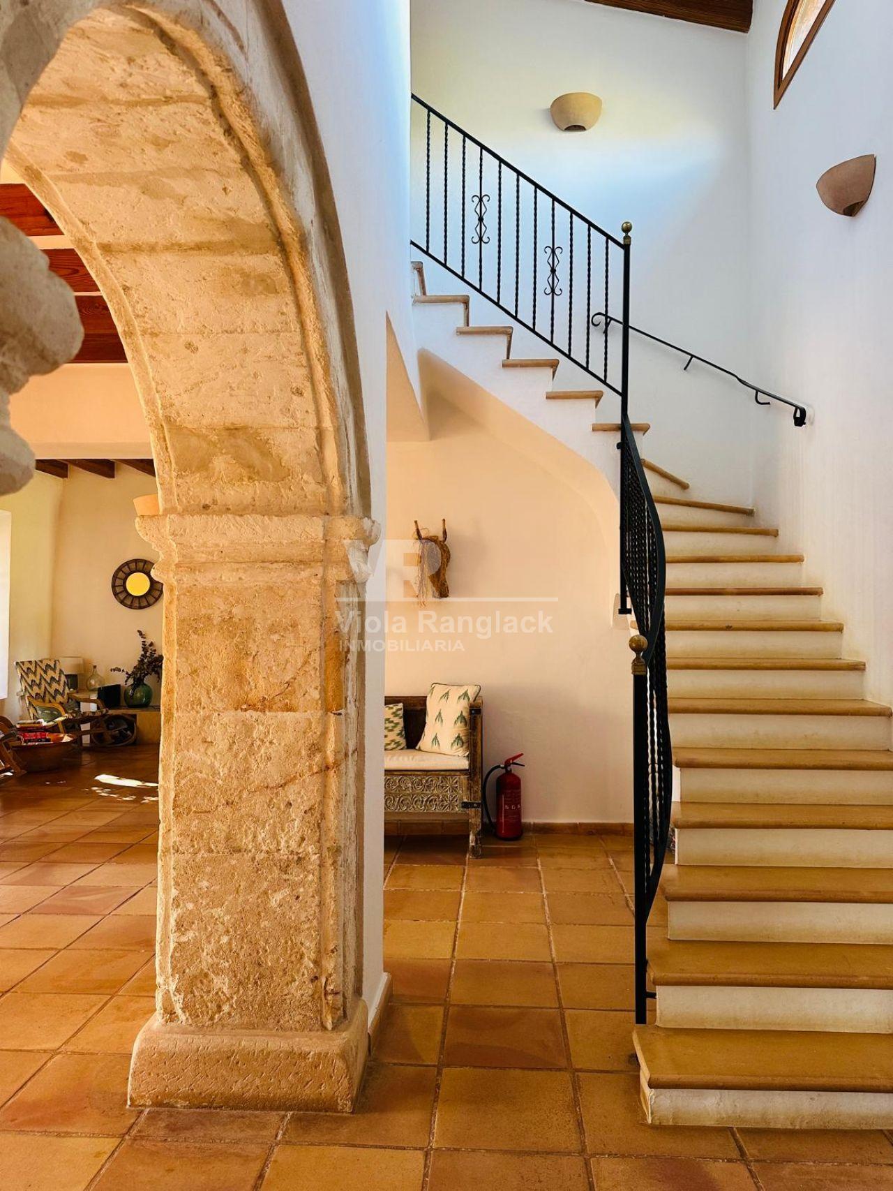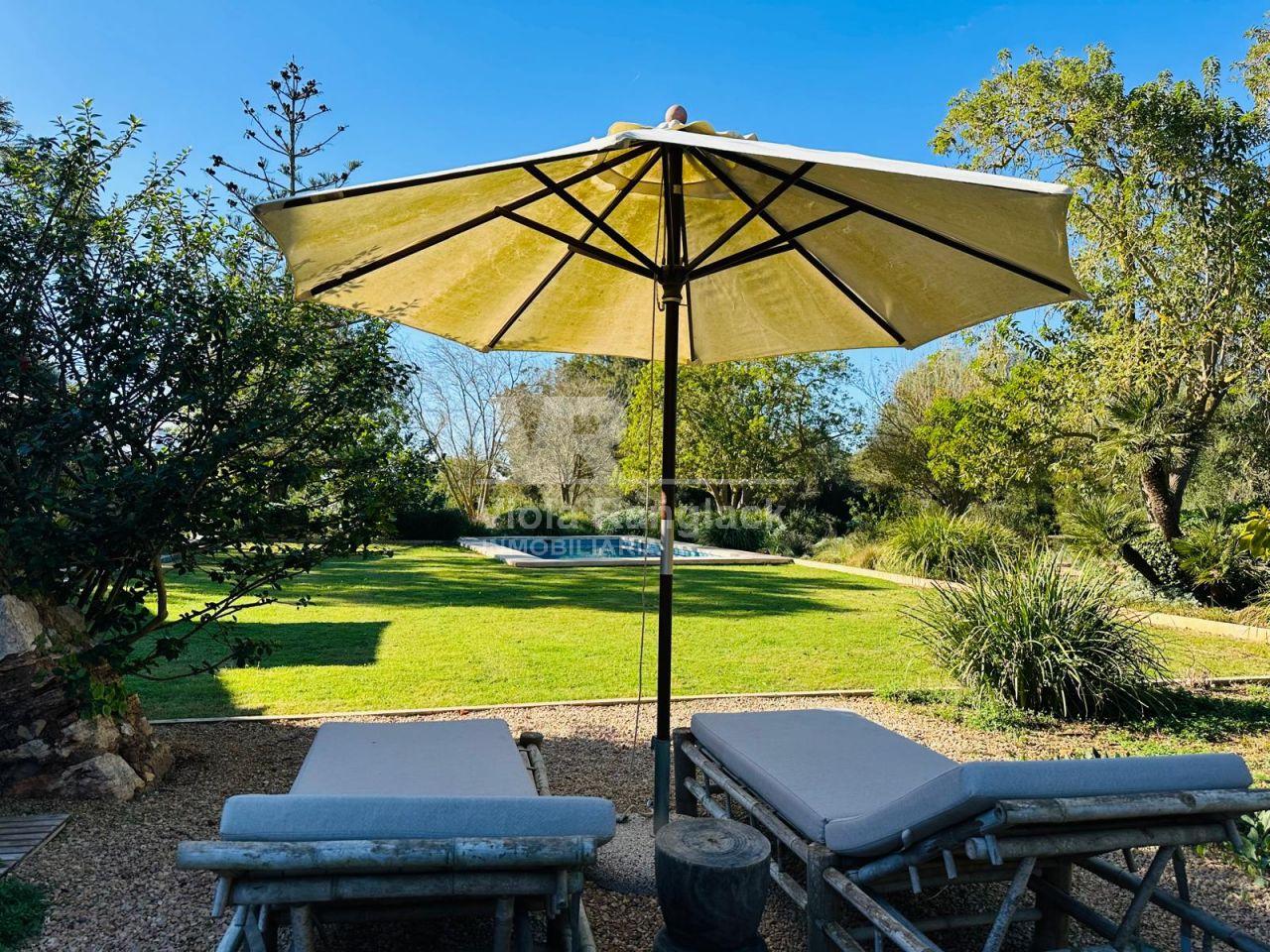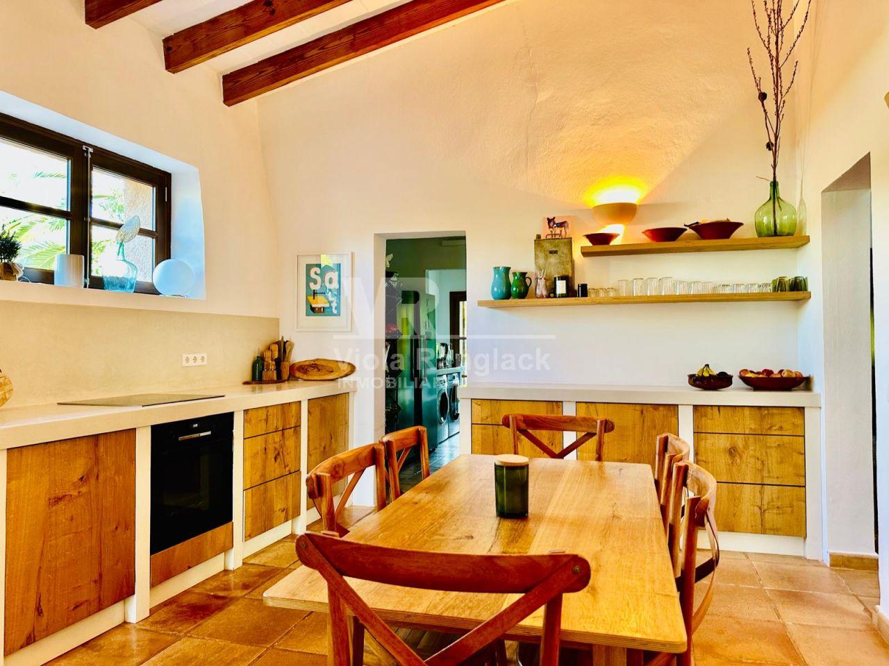 Dentro del mismo terreno y comunicada por el jardín se encuentra una acogedora casa de invitados de 105 m², distribuida en dos plantas con espacios abiertos. Predominan las paredes de marés sellado y suelos de terracota, manteniendo el estilo mallorquín con acabados de alta calidad.