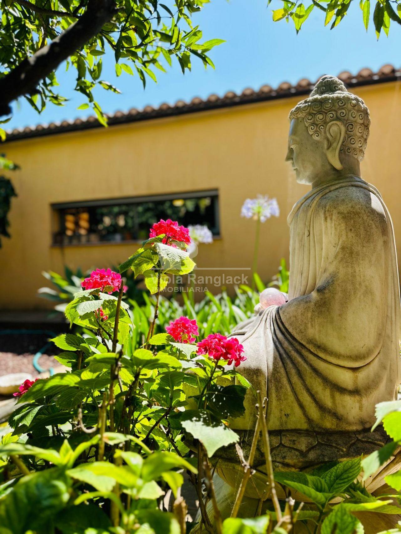 Un largo camino de entrada a lo largo de la plantación de olivos le lleva a la propiedad. En la planta baja se encuentra el amplio salón-comedor con chimenea, la cocina americana, 2 dormitorios y 3 baños, uno de ellos en suite. La característica especial es el patio, situado en el centro de la casa. Está adornado con un pequeño estanque y plantas mediterráneas. Gracias a las numerosas puertas correderas de cristal, se puede mirar al hermoso patio desde todas las habitaciones. Además, la casa inspira con sus techos altos, que dan una aireada sensación de espacio. A través del patio se accede al apartamento independiente para invitados, que es completamente autosuficiente. Dispone de una sala de estar, una cocina, un dormitorio y un cuarto de baño. Desde la sala de estar, también tiene acceso directo a una gran terraza con una magnífica vista del paisaje mediterráneo.