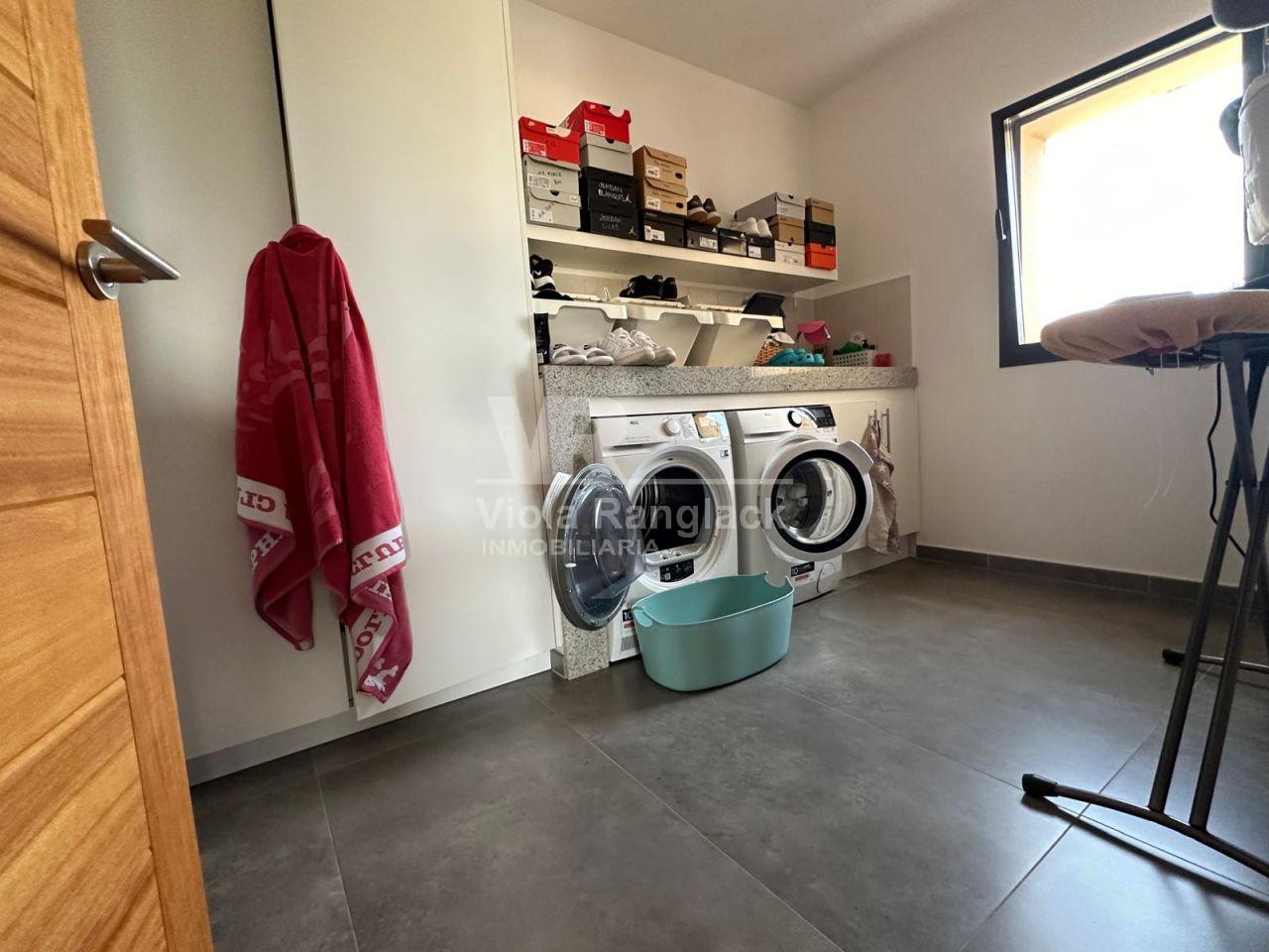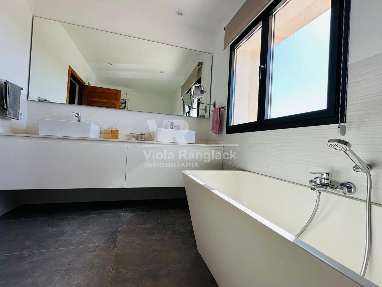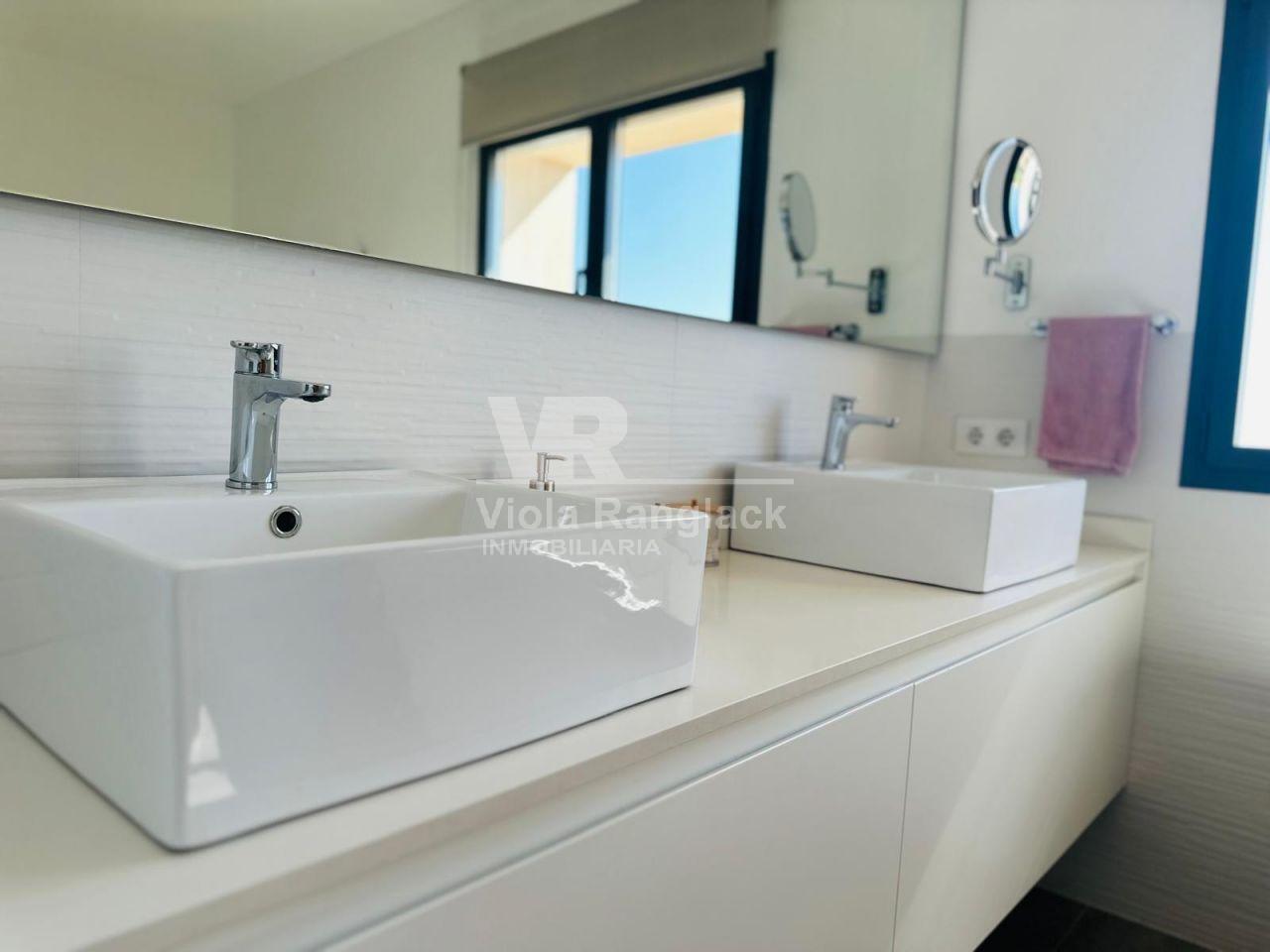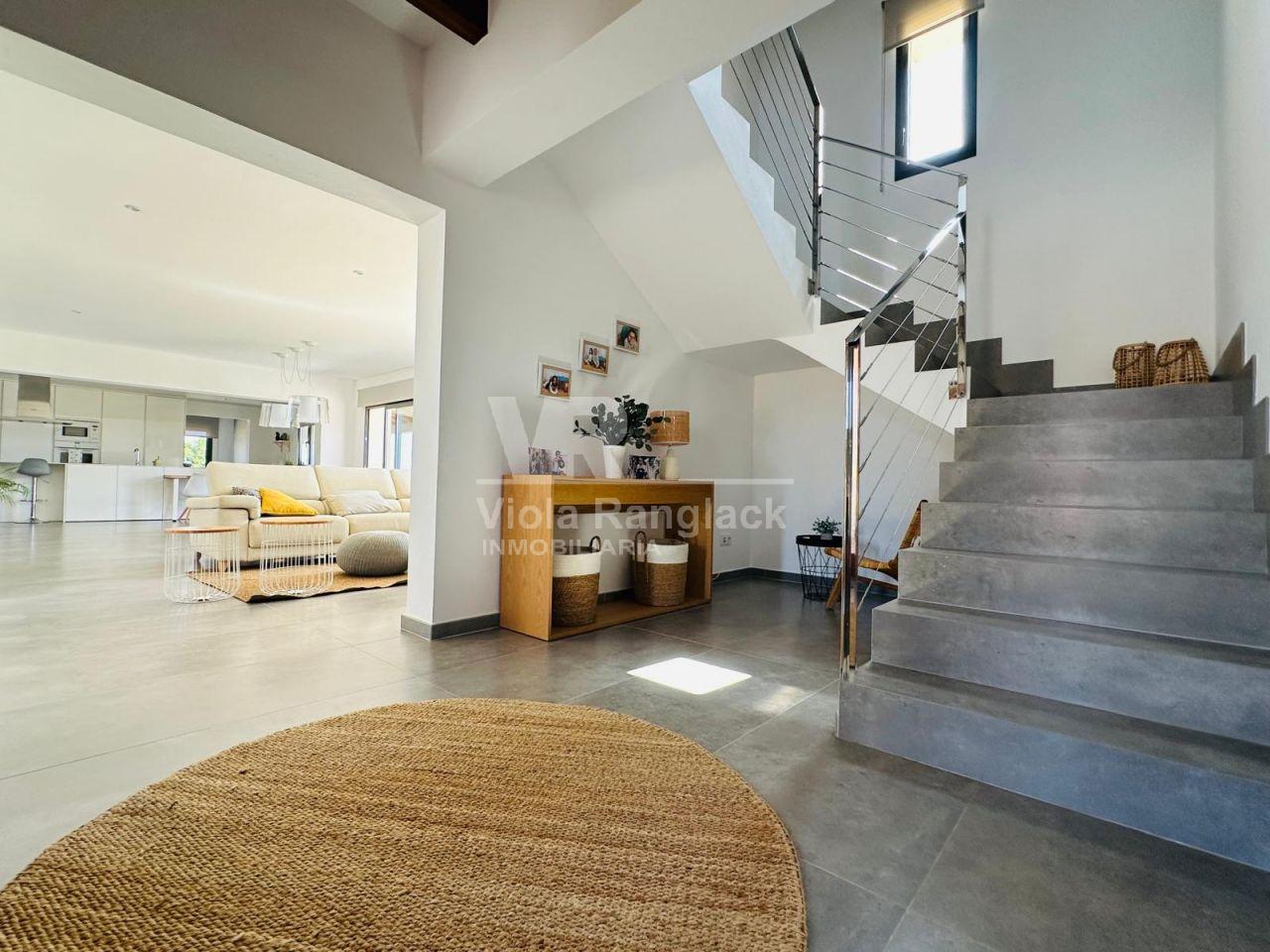 La casa esta orientada al Noreste con fabulosas vistas al mar. En la llegada del terreno, hay una barrera automatica, y el terreno esta rodeado de pared de piedra. Toda la fachada de la casa esta hecha de piedra. En la entrada principal de la casa, justo a la derecha puede encontrar un aseo, a continuacion se encuentra un fabuloso dormitorio con gran baño completo en suite, y unas escaleras que llevan a la parte superior de la casa, a la izquiera encontrara el gran salon-cocina-comedor de 160m2 con grandes ventanales con vistas al jardin y a la piscina. Si continua en esta sala, al final del todo puede encontrar una pequeña sala con preciosas vistas a las montañas. En esta planta puede encontrar 2 plazas de parking en interior de la casa con acceso a la vivienda, coladuria y lavanderia.