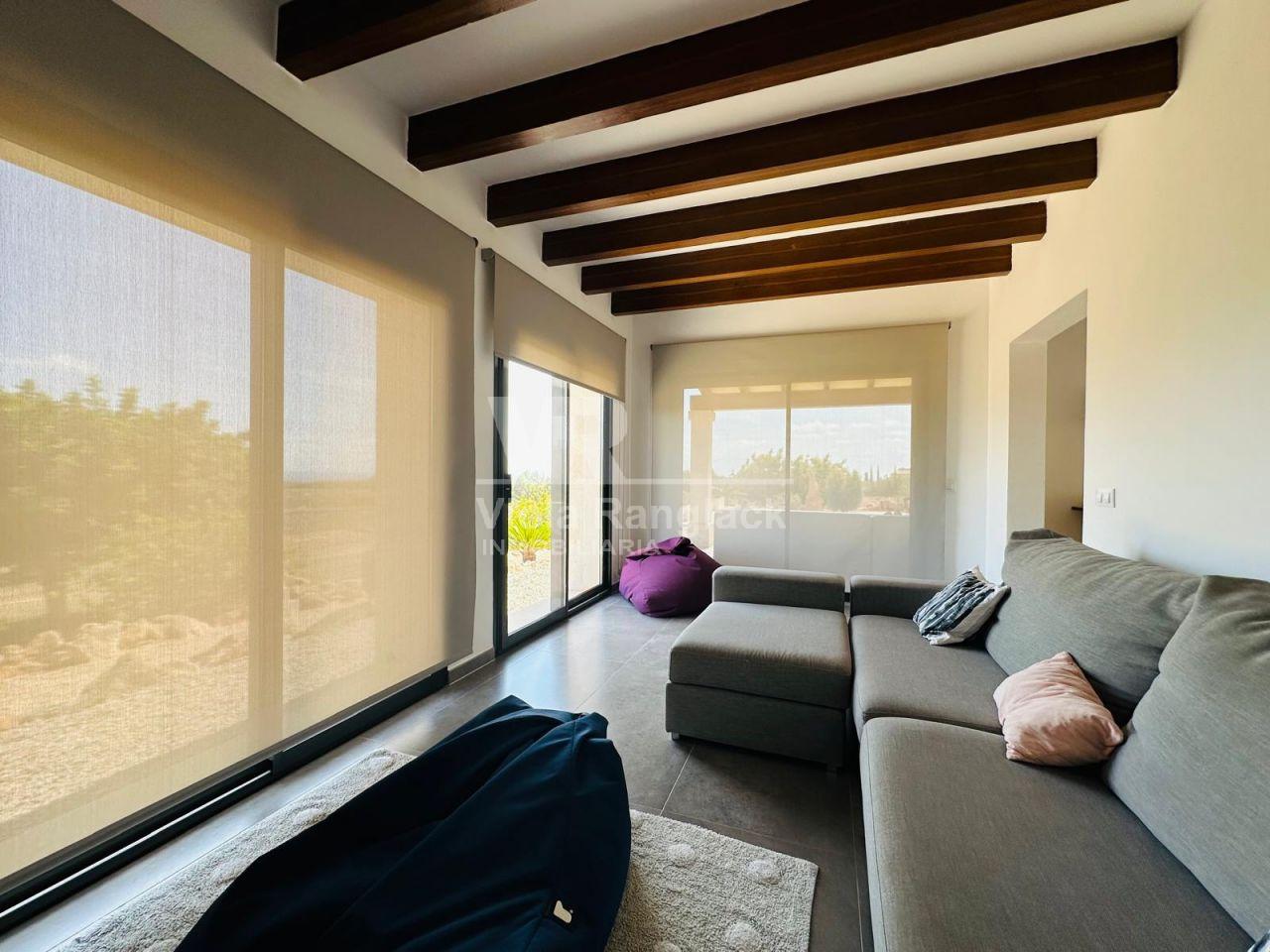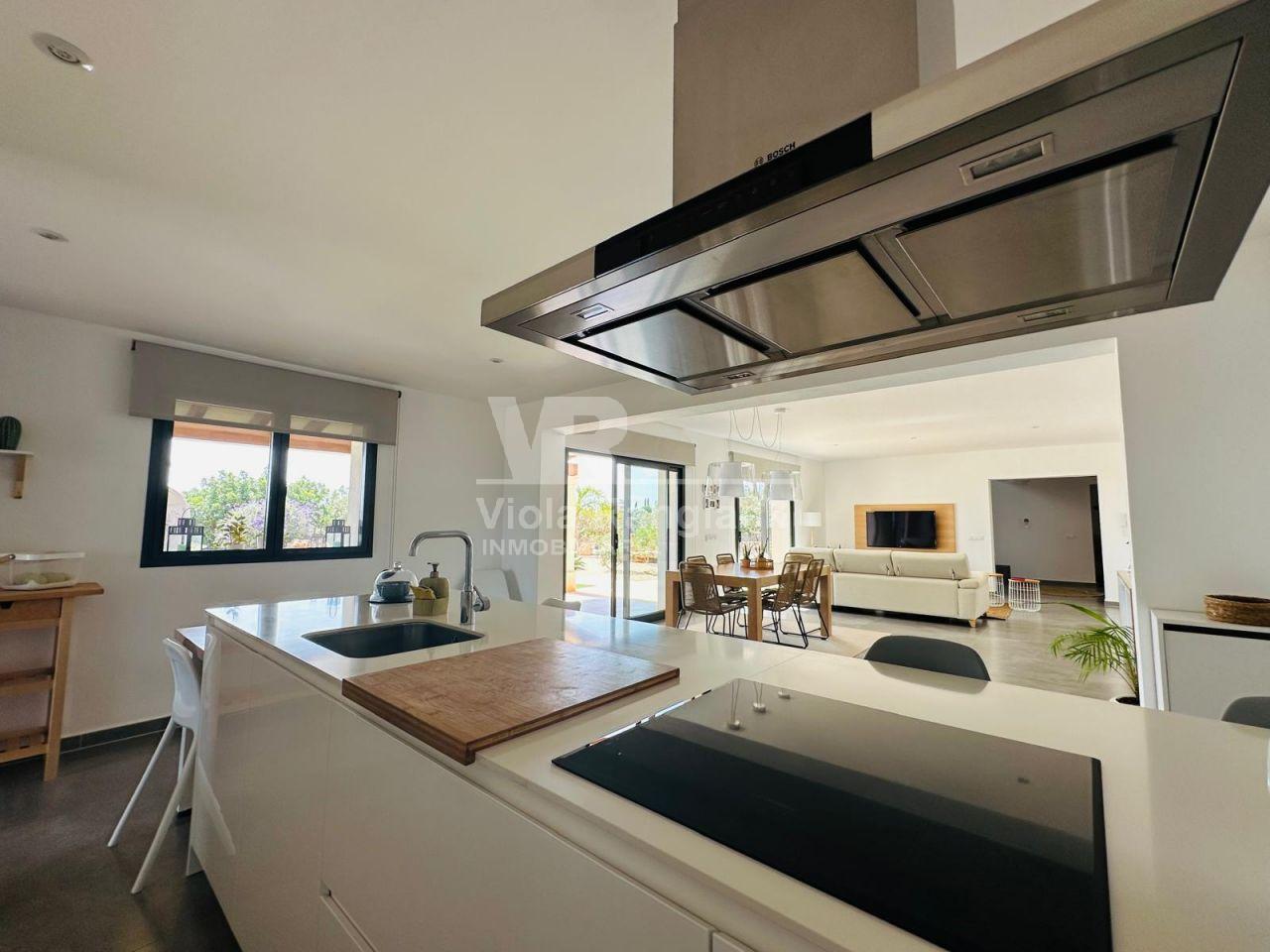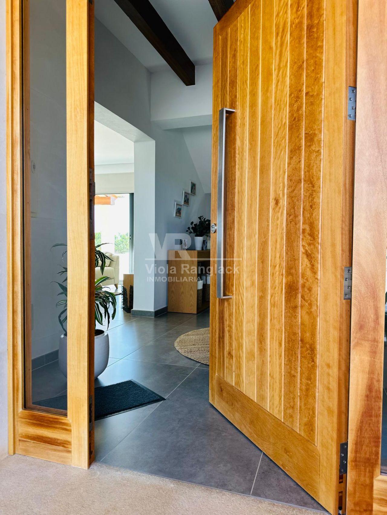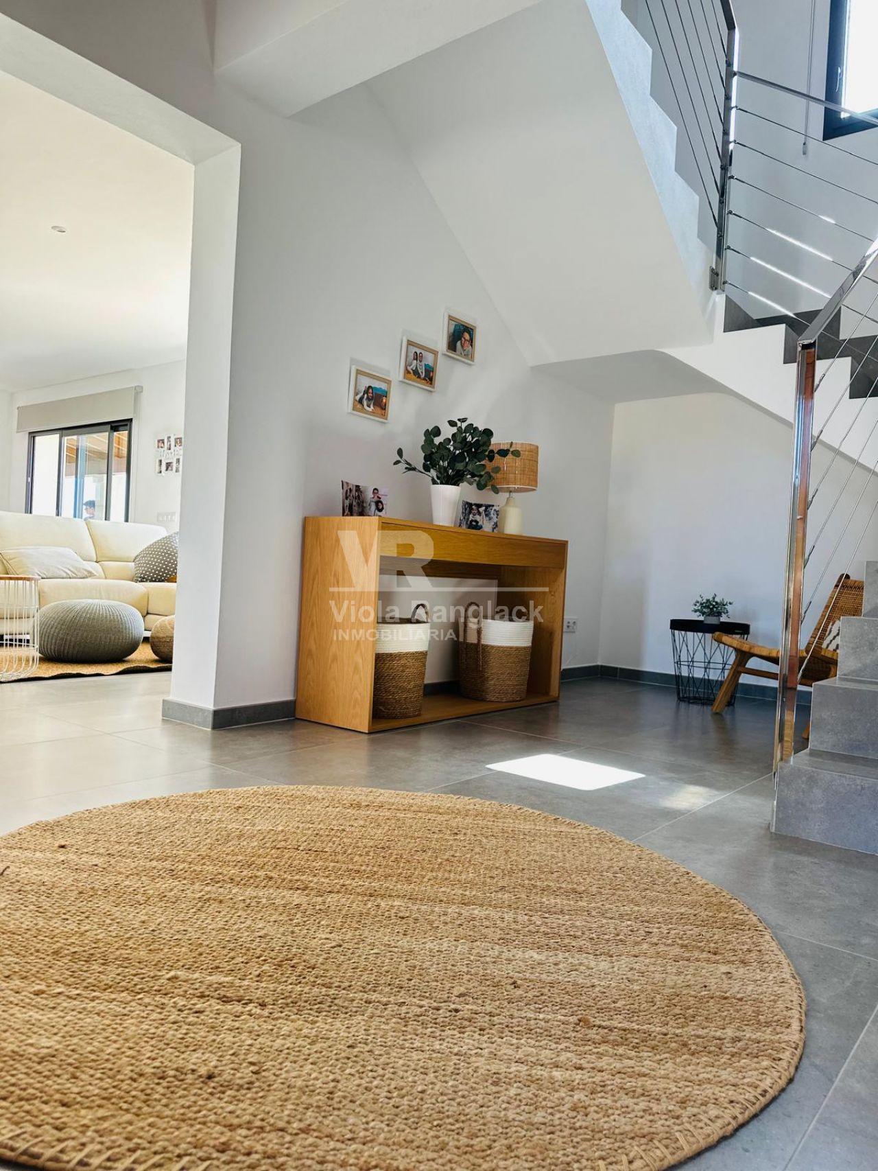 La casa esta orientada al Noreste con fabulosas vistas al mar. En la llegada del terreno, hay una barrera automatica, y el terreno esta rodeado de pared de piedra. Toda la fachada de la casa esta hecha de piedra. En la entrada principal de la casa, justo a la derecha puede encontrar un aseo, a continuacion se encuentra un fabuloso dormitorio con gran baño completo en suite, y unas escaleras que llevan a la parte superior de la casa, a la izquiera encontrara el gran salon-cocina-comedor de 160m2 con grandes ventanales con vistas al jardin y a la piscina. Si continua en esta sala, al final del todo puede encontrar una pequeña sala con preciosas vistas a las montañas. En esta planta puede encontrar 2 plazas de parking en interior de la casa con acceso a la vivienda, coladuria y lavanderia.