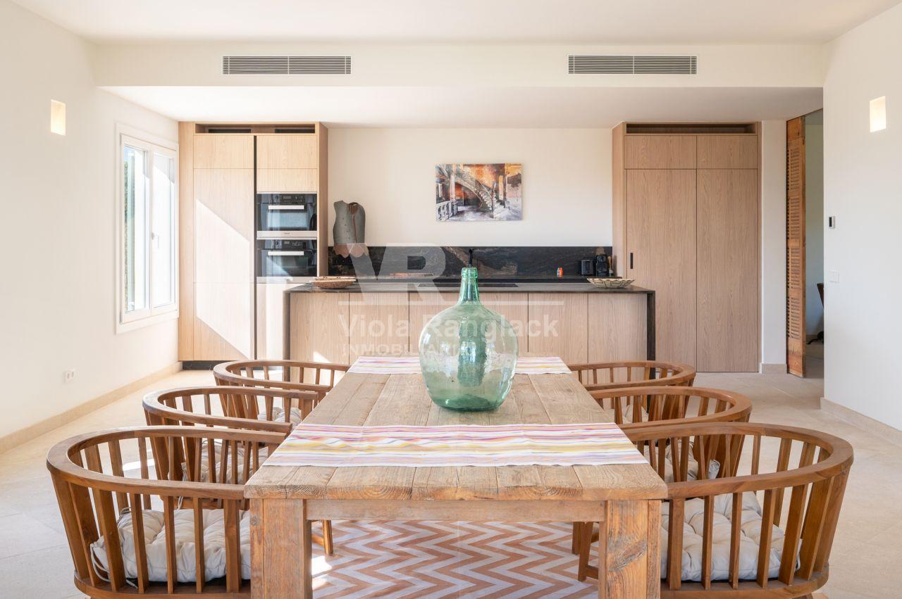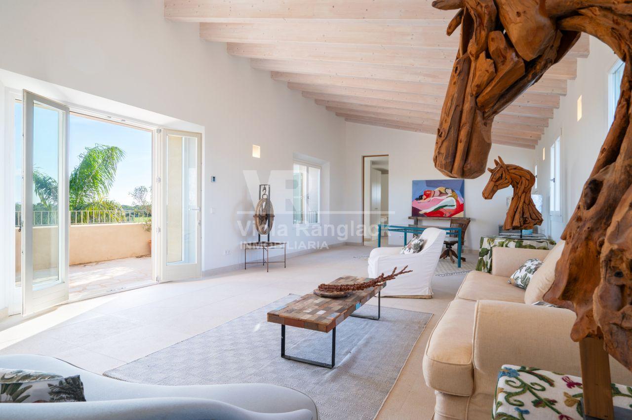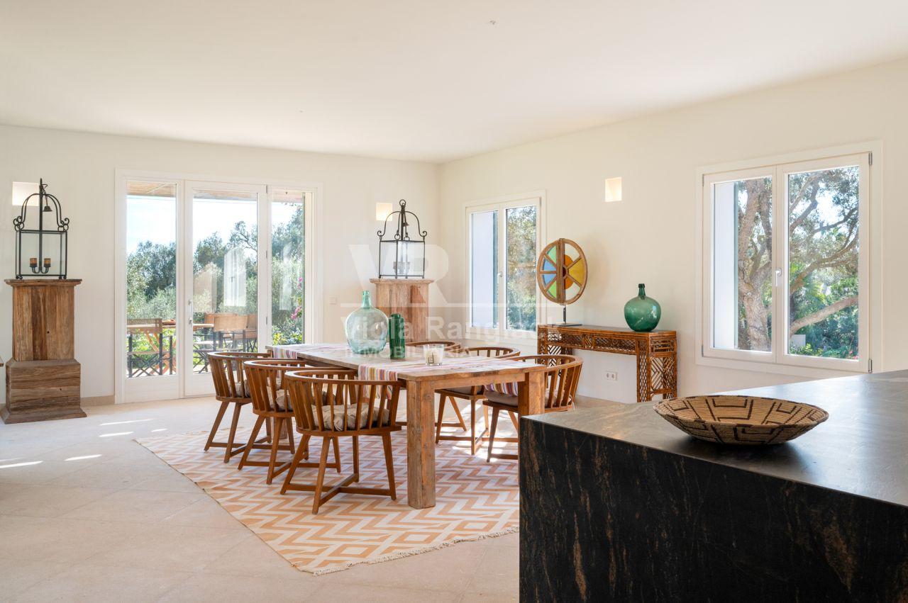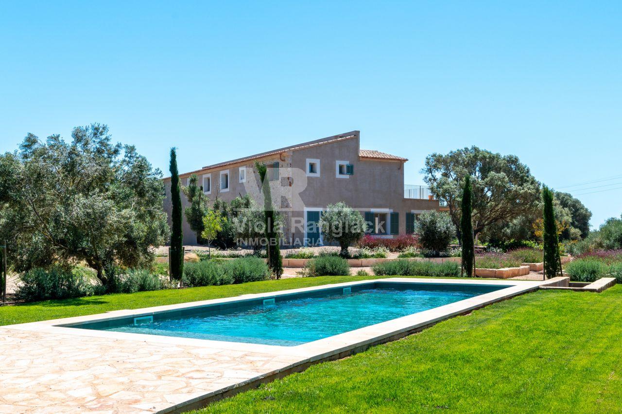 Cerca de las playas de Es Trenc, se encuentra esta finca contemporánea con piscina en una parcela que brinda impresionantes vistas hasta la isla de Cabrera. Construida con los materiales de alta calidad y con elementos tradicionales mallorquines, esta villa promete ser un referente de lujo.