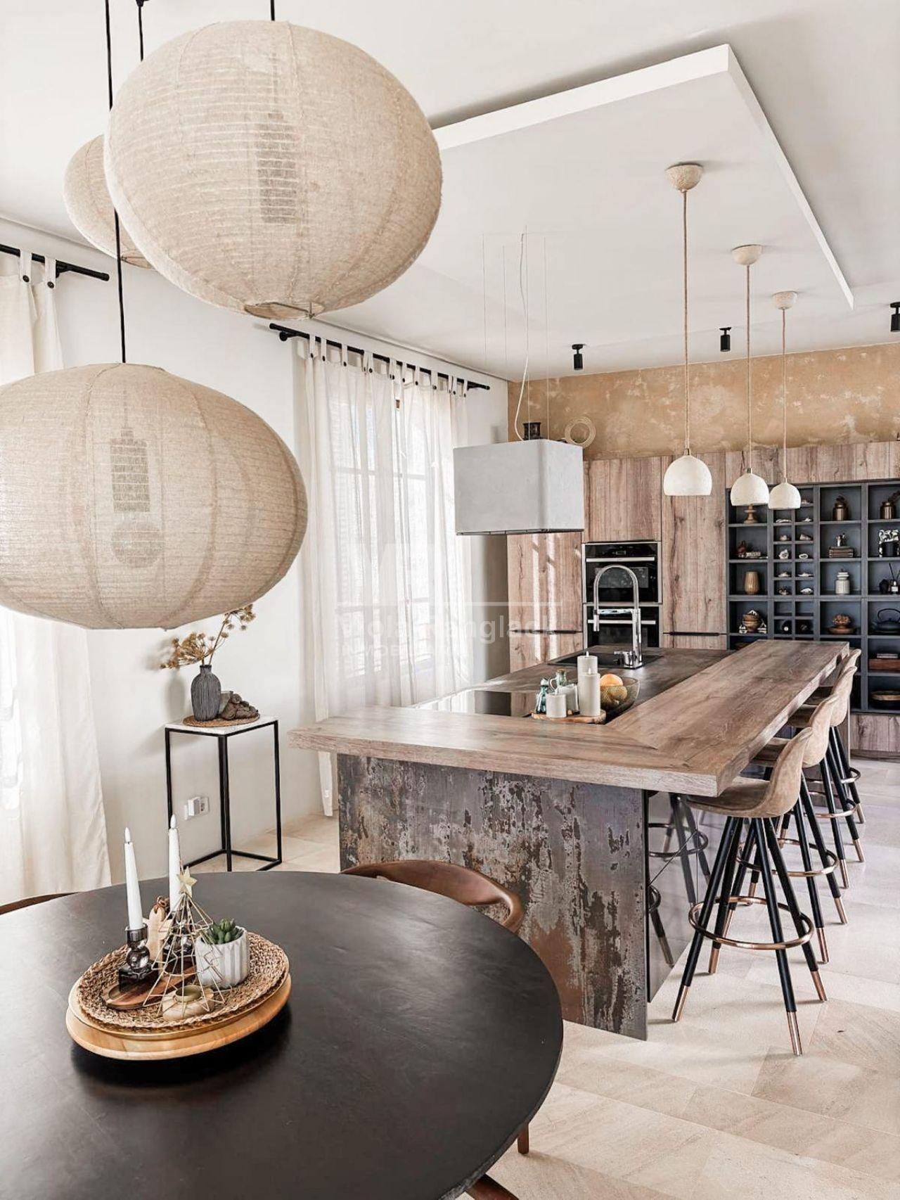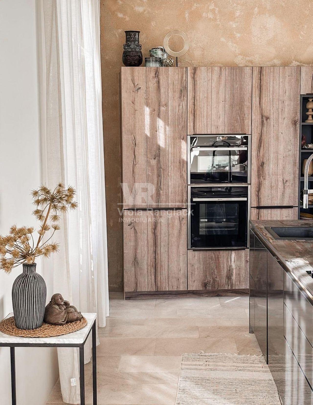 El salón abierto, con techos altos, desprende espacio y calidez. La moderna cocina es una joya en el interior, con una elegante isla de cocina y electrodomésticos Neff de alta calidad: un horno, una combinación horno-microondas, una placa de inducción, un extractor, un lavavajillas y un frigorífico con cajones FreshSafe. Además, hay un congelador independiente con dos grandes cajones. La encimera, de Dekton, ofrece una superficie ultracompacta y duradera, resistente a los arañazos, el calor y las manchas gracias a su avanzada tecnología.
