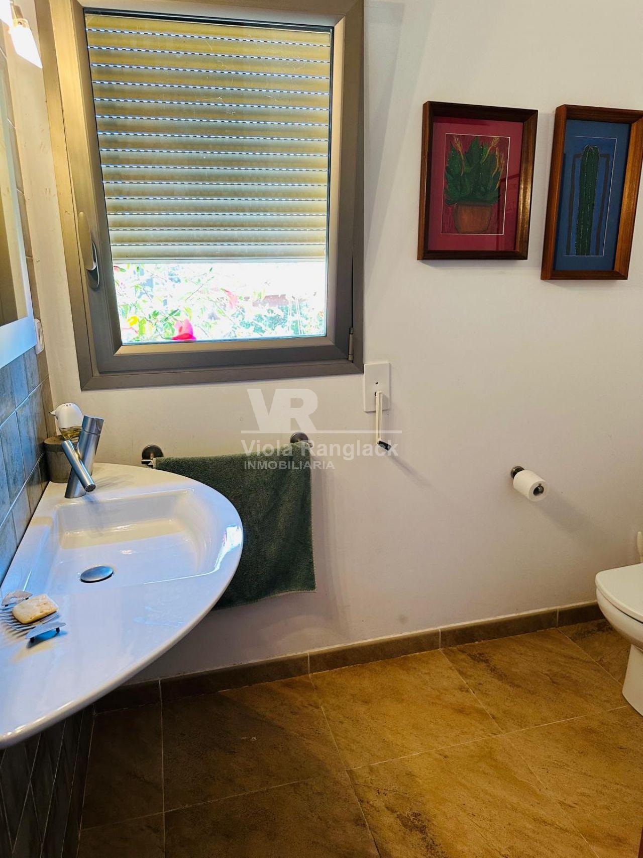 Im Erdgeschoss befinden sich das geräumige Wohn-Esszimmer mit Kamin, die offene Küche, 2 Schlafzimmer und 3 Bäder, eines davon en suite. Die Besonderheit ist der Patio, der sich in der Mitte des Hauses befindet. Er ist mit einem kleinen Teich und mediterranen Pflanzen geschmückt. Dank der zahlreichen Glasschiebetüren kann man von allen Zimmern aus auf den schönen Innenhof blicken. Darüber hinaus begeistert das Haus mit seinen hohen Decken, die ein luftiges Raumgefühl vermitteln. Über den Innenhof gelangt man in die separate Gästewohnung, die komplett autark ist. Sie verfügt über ein Wohnzimmer, eine Küche, ein Schlafzimmer und ein Bad. Vom Wohnzimmer aus haben Sie auch direkten Zugang zu einer großen Terrasse mit einem herrlichen Blick auf die mediterrane Landschaft.
