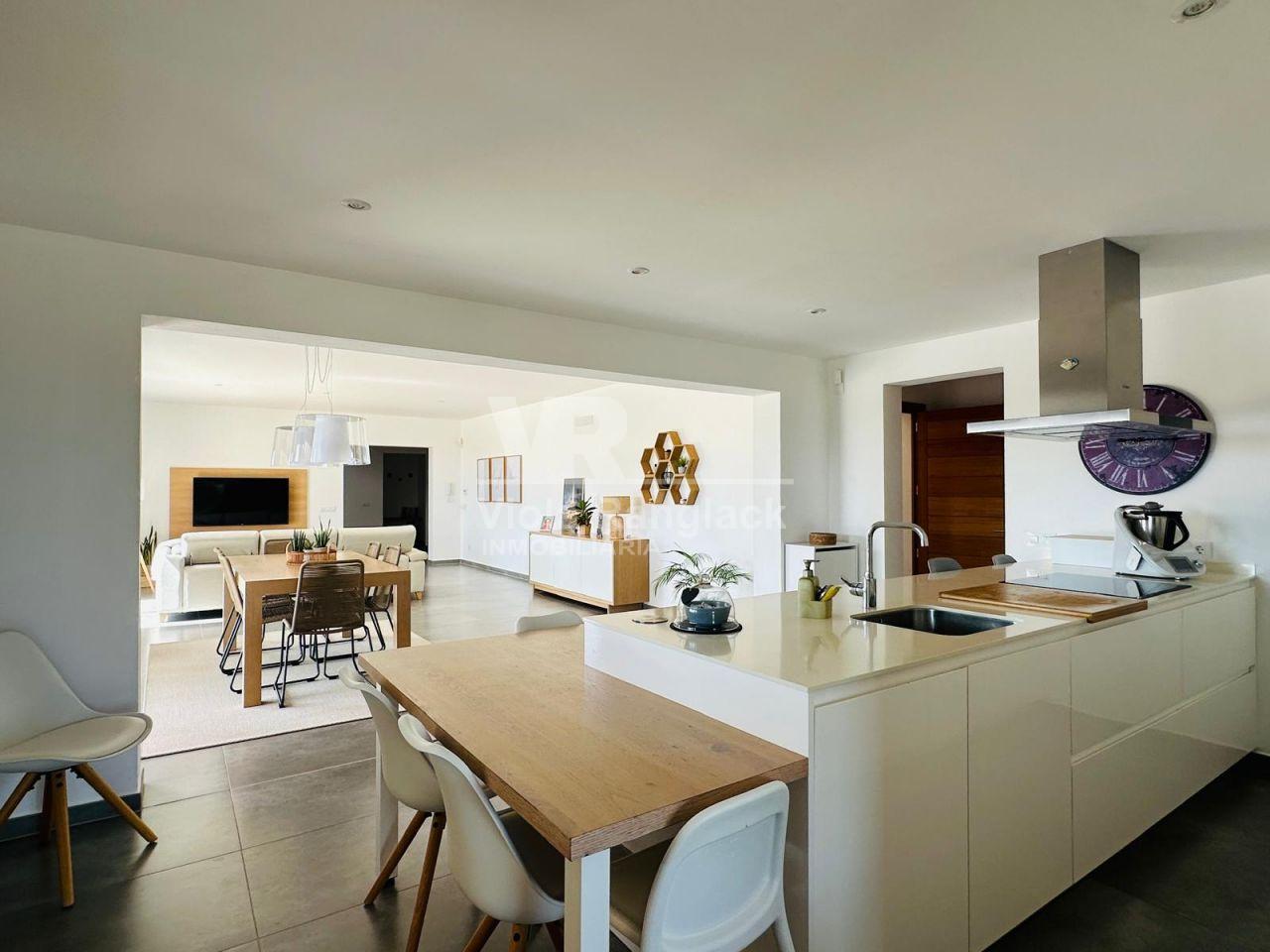 Das Haus ist nach Nordosten ausgerichtet und bietet einen fantastischen Blick auf das Meer. Bei der Ankunft des Grundstücks, gibt es eine automatische Schranke, und das Grundstück ist von einer Steinmauer umgeben. Die gesamte Fassade des Hauses ist aus Stein. Am Haupteingang des Hauses, gleich rechts finden Sie eine Gästetoilette, dann finden Sie ein fabelhaftes Schlafzimmer mit großem Bad en suite, und eine Treppe, die in den oberen Teil des Hauses führt, auf der linken Seite finden Sie das große Wohnzimmer-Küche-Esszimmer von 160m2 mit großen Fenstern mit Blick auf den Garten und Pool. Wenn Sie in diesem Raum weitergehen, können Sie am Ende ein kleines Zimmer mit schöner Aussicht auf die Berge finden. Auf dieser Etage finden Sie 2 Parkplätze im Inneren des Hauses mit Zugang zum Haus, Waschküche und Hauswirtschaftsraum.