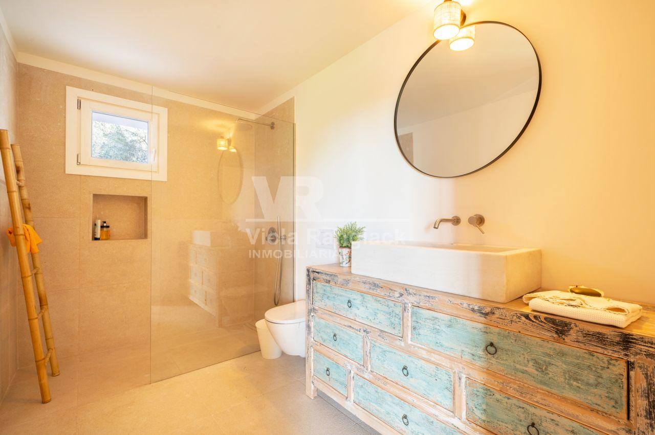 The main house has a spacious entrance hall leading to a separate living room. From here, you can access a veranda overlooking the garden. On one side is a spacious room that connects the living and dining rooms and adjoins an integrated, fully equipped kitchen. On the opposite side, a hallway leads to two bedrooms, each with its own bathroom. One of these rooms also has a bathtub, a walk-in wardrobe and direct access to the garden and pool. There is also a guest toilet. On the second floor, there is a living room, three bedrooms with en-suite bathrooms and two terraces with views of the island of Cabrera.